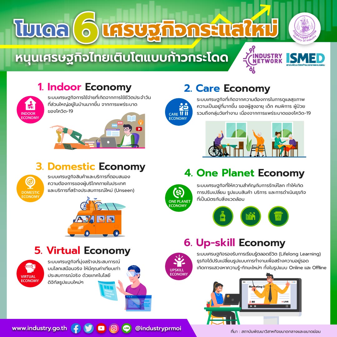 โมเดล 6 เศรษฐกิจกระแสใหม่ หนุนเศรษฐกิจไทยเติบโตแบบก้าวกระโดด ขับเคลื่อนด้วยภาคเศรษฐกิจกระแสใหม่ใน 6 มิติที่สำคัญ ได้แก่