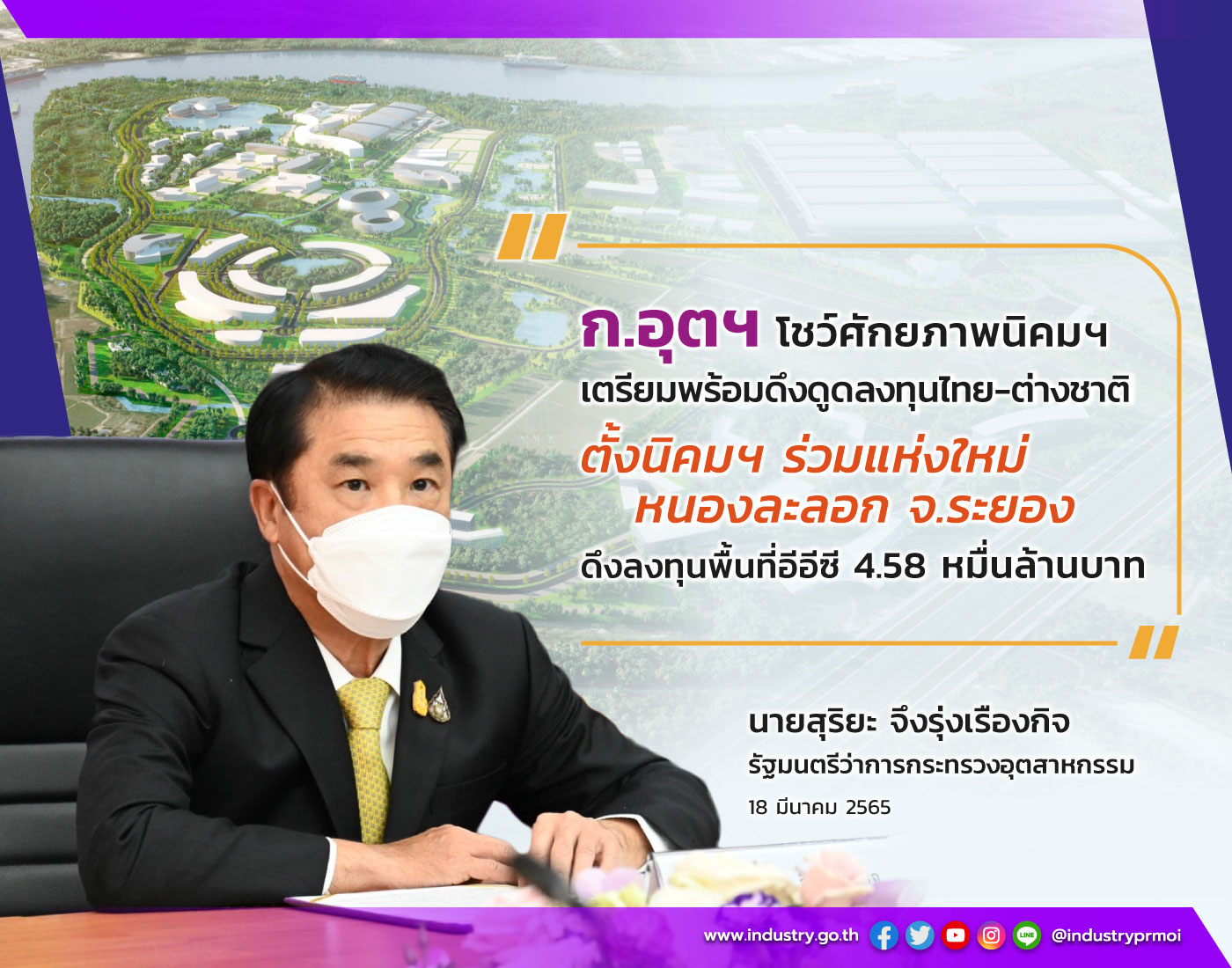 “สุริยะ” กำชับ กนอ.เตรียมความพร้อมพื้นที่นิคมอุตสาหกรรมทุกภูมิภาค ดึงดูดนักลงทุนทั้งไทยและต่างชาติ ด้าน “วีริศ” เผย บอร์ด กนอ.อนุมัติหลักการจัดตั้งนิคมอุตสาหกรรมใหม่ในพื้นที่อีอีซี เล็งรองรับอุตสาหกรรมเป้าหมาย คาดหลังเปิดดำเนินการจะสร้างเม็ดเงินลงทุนในประเทศกว่า 45,840 ล้านบาท เกิดการจ้างงานเพิ่ม 11,460 คน