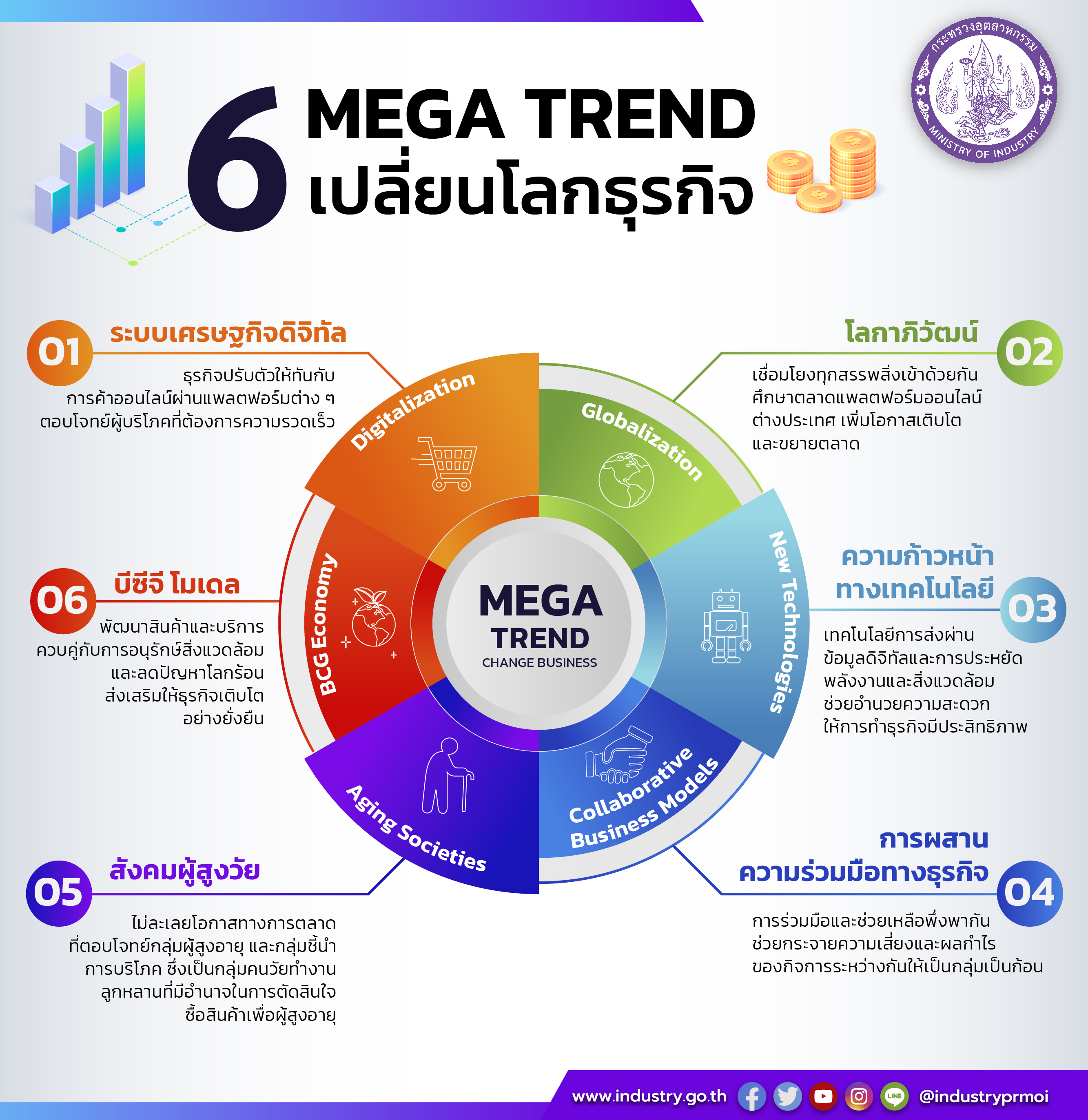 กระทรวงอุตสาหกรรม หรือ MIND แนะผู้ประกอบการปรับตัวรับ 6 เมกะเทรนด์เพื่อสร้างโอกาสทางธุรกิจ พร้อมพุ่งเป้าปรับโครงสร้างการผลิตสู่เศรษฐกิจฐานนวัตกรรม ภายใต้แนวคิด “Industry 4.0” ที่ขับเคลื่อนด้วยองค์ความรู้และเทคโนโลยีขั้นสูง มีความคิดสร้างสรรค์และนวัตกรรม ที่จะช่วยเพิ่มมูลค่าสินค้า และเป็นมิตรต่อสิ่งแวดล้อม เพื่อพัฒนาอุตสาหกรรมไทยให้พร้อมเดินไปข้างหน้าอย่างมั่นคง และยั่งยืน