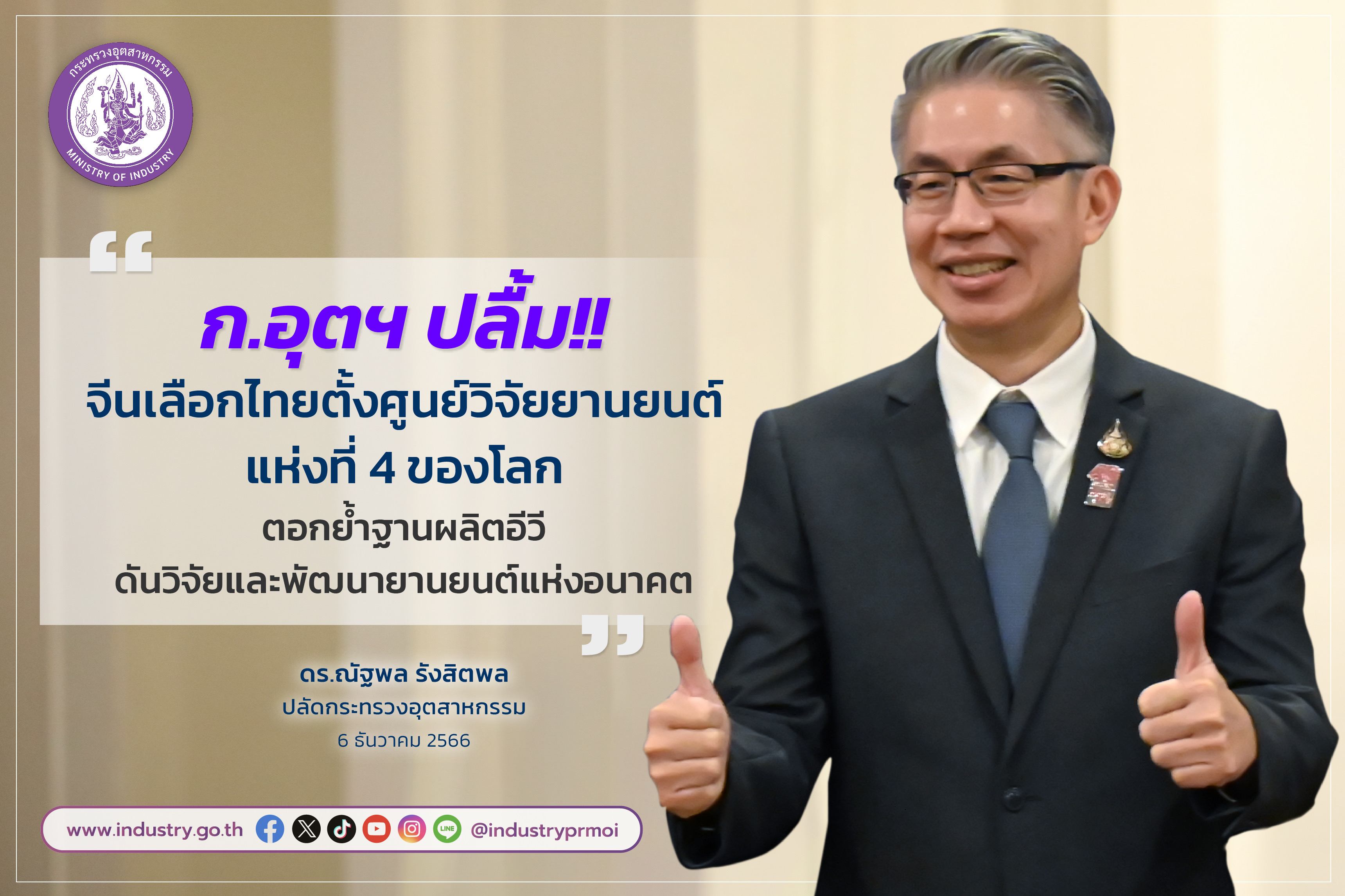 ดร.ณัฐพล รังสิตพล ปลัดกระทรวงอุตสาหกรรม เปิดเผยว่า รัฐบาลและกระทรวงอุตสาหกรรม ได้ให้ความสำคัญกับการพัฒนาอุตสาหกรรมยานยนต์ไฟฟ้าไปพร้อมกับการพัฒนาอุตสาหกรรมยานยนต์ เครื่องยนต์สันดาป (ICE) โดยร่วมกับหน่วยงานที่เกี่ยวข้องทั้งภาครัฐและภาคเอกชน ขับเคลื่อนนโยบายและมาตรการต่าง ๆ ผ่านคณะกรรมการนโยบายยานยนต์ไฟฟ้าแห่งชาติ พร้อมให้ความสำคัญกับการวางรากฐานของการวิจัยและพัฒนายานยนต์และชิ้นส่วนในประเทศ รวมทั้งการกำหนดมาตรฐาน เพื่อสร้างความเชื่อมั่น ดังนั้น หน่วยงานกำหนดมาตรฐาน และหน่วยงานทดสอบและรับรอง ถือเป็นหัวใจสำคัญของการพัฒนาอุตสาหกรรมยานยนต์ให้เติบโตได้อย่างยั่งยืน ซึ่งการจัดตั้งศูนย์วิจัยเทคโนโลยียานยนต์จีน หรือ China Automotive Technology and Research Center (CATARC) สำนักงานสาขาในภูมิภาคเอเชียตะวันออกเฉียงใต้ ประจำประเทศไทย ถือเป็นจุดเริ่มต้นความร่วมมือในการนำศักยภาพด้านการพัฒนานโยบาย การกำหนดมาตรฐาน และการรับรอง รวมทั้งเครือข่ายอุตสาหกรรมยานยนต์สมัยใหม่ของจีนมาเชื่อมโยงในการพัฒนาอุตสาหกรรม และโครงสร้างพื้นฐานยานยนต์ของประเทศไทย เพื่อรองรับการเป็นฐานการผลิตยานยนต์ของภูมิภาคอาเซียน และฐานการผลิตที่สำคัญของโลก