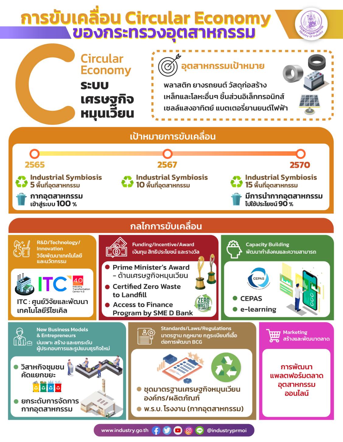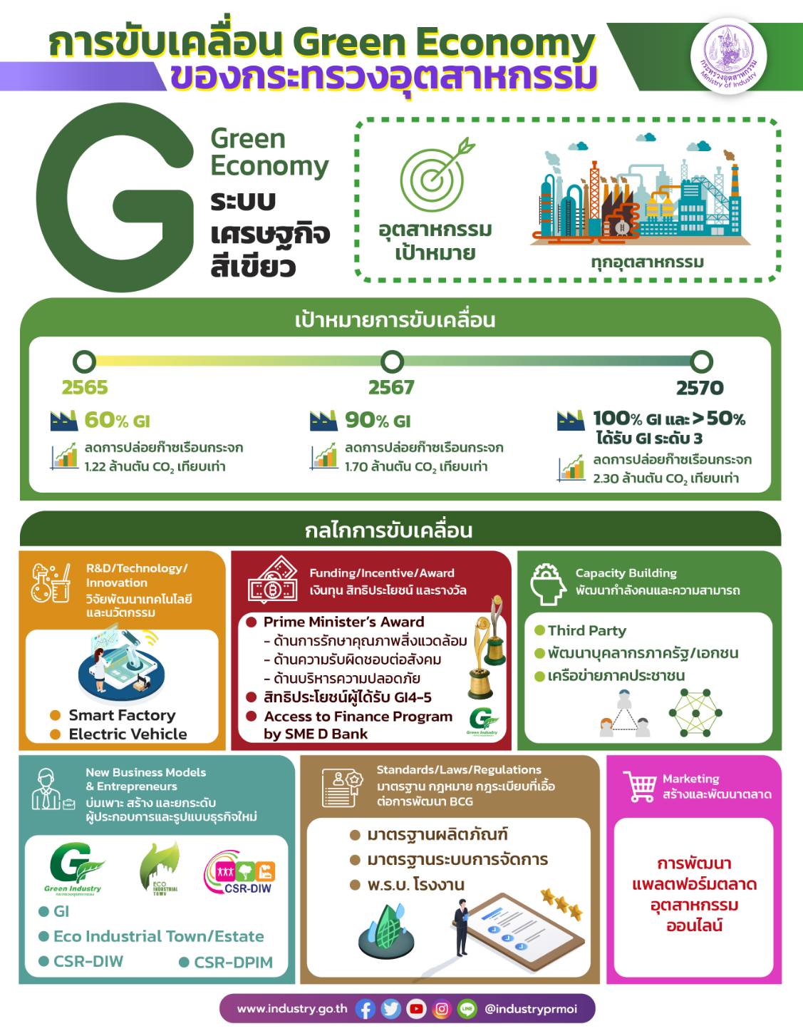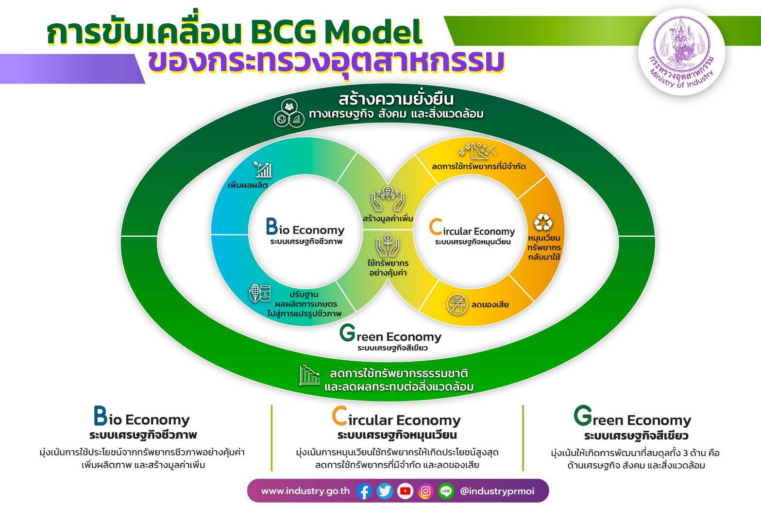 แนวทางการขับเคลื่อนการพัฒนาเศรษฐกิจชีวภาพ-เศรษฐหมุนเวียน-เศรษฐกิจสีเขียว (Bio-Circular-Green Economy : BCG Model) ของกระทรวงอุตสาหกรรม เป็นการสร้างความยั่งยืนทางเศรษฐกิจ สังคม และสิ่งแวดล้อม ลดการใช้ทรัพยากรธรรมชาติและสิ่งแวดล้อม