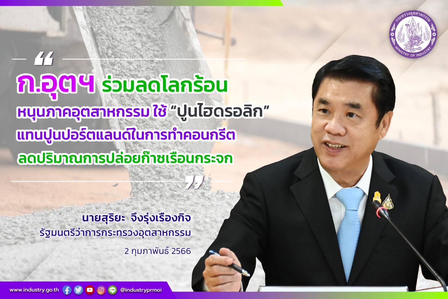 นายสุริยะ จึงรุ่งเรืองกิจ รัฐมนตรีว่าการกระทรวงอุตสาหกรรม เปิดเผยว่า ปัญหาโลกร้อนเป็นปัญหาที่ทุกฝ่ายต้องร่วมมือกันแก้ไข เพื่อบรรเทาผลกระทบทางด้านสิ่งแวดล้อมที่จะเกิดแก่ประชากรโลก กระทรวงอุตสาหกรรม ในฐานะหน่วยงานที่กำกับดูแลภาคอุตสาหกรรม จึงได้กำหนดนโยบายเพื่อร่วมแก้ไขปัญหาภาวะโลกร้อน โดยมอบหมายให้สำนักงานมาตรฐานผลิตภัณฑ์อุตสาหกรรม (สมอ.) เร่งรัดดำเนินการกำหนดมาตรฐานเพื่อช่วยแก้ปัญหาดังกล่าว ซึ่งผมได้รับรายงานว่า สมอ. ได้มีการกำหนดและแก้ไขมาตรฐานผลิตภัณฑ์ที่เกี่ยวข้องกับคอนกรีตและปูนซีเมนต์ โดยให้สามารถใช้ปูนซีเมนต์ไฮดรอลิกเป็นวัตถุดิบในการทำผลิตภัณฑ์คอนกรีตต่างๆ แทนการใช้ปูนซีเมนต์ปอร์ตแลนด์ ซึ่งการผลิตปูนซีเมนต์ไฮดรอลิกทำให้เกิดก๊าซคาร์บอนไดออกไซด์ซึ่งเป็นหนึ่งในก๊าซเรือนกระจกน้อยกว่าการผลิตปูนซีเมนต์ปอร์ตแลนด์ โดยมีการคิดค้นพัฒนาการผลิตปูนซีเมนต์ไฮดรอลิก ซึ่งมีส่วนประกอบของปูนเม็ดในอัตราส่วนที่น้อยกว่าปูนซีเมนต์ปอร์ตแลนด์ประมาณร้อยละ 10 ของปริมาณทั้งหมด โดยใช้วัสดุอื่นมาผสมทดแทน เช่น หินปูน กากถลุง และปอซโซลาน เป็นต้น จากองค์ประกอบที่มีอัตราส่วนของปูนเม็ดน้อยลง จึงทำให้เกิดก๊าซคาร์บอนไดออกไซด์ในกระบวนการผลิตน้อยลงตามไปด้วย โดยปูนซีเมนต์ไฮดรอลิกนั้นมีคุณสมบัติและประสิทธิภาพในการนำไปใช้งานที่ดีเทียบเท่ากับปูนซีเมนต์ปอร์ตแลนด์ หากประมาณการเบื้องต้นในเชิงของการผลิตปูนซีเมนต์ไฮดรอลิก 1 ตัน จะสามารถลดการปล่อยก๊าซคาร์บอนไดออกไซด์ได้ถึง 0.05 ตัน (CO2) เมื่อเทียบกับการผลิตปูนซีเมนต์ปอร์ตแลนด์ในปริมาณที่เท่ากัน ดังนั้น การนำปูนซีเมนต์ไฮดรอลิกมาใช้งานทดแทนปูนซีเมนต์ปอร์ตแลนด์ จึงเป็นอีกหนทางหนึ่งที่จะช่วยลดปริมาณการปล่อยก๊าซเรือนกระจก เพื่อช่วยบรรเทาปัญหาภาวะโลกร้อนได้