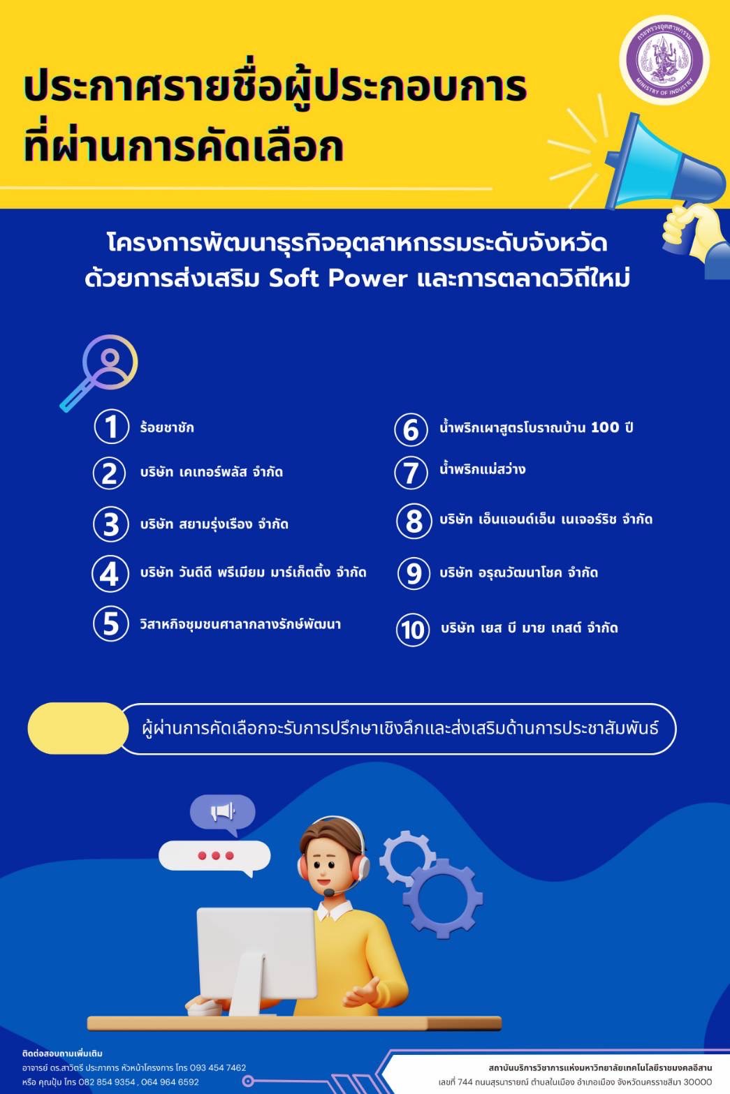 กระทรวงอุตสาหกรรม ประกาศรายชื่อ 10 ผู้ประกอบการ ที่ผ่านการคัดเลือก ภายใต้ โครงการพัฒนาธุรกิจอุตสาหกรรมระดับจังหวัด ด้วยการส่งเสริม Soft Power และการตลาดวิถีใหม่