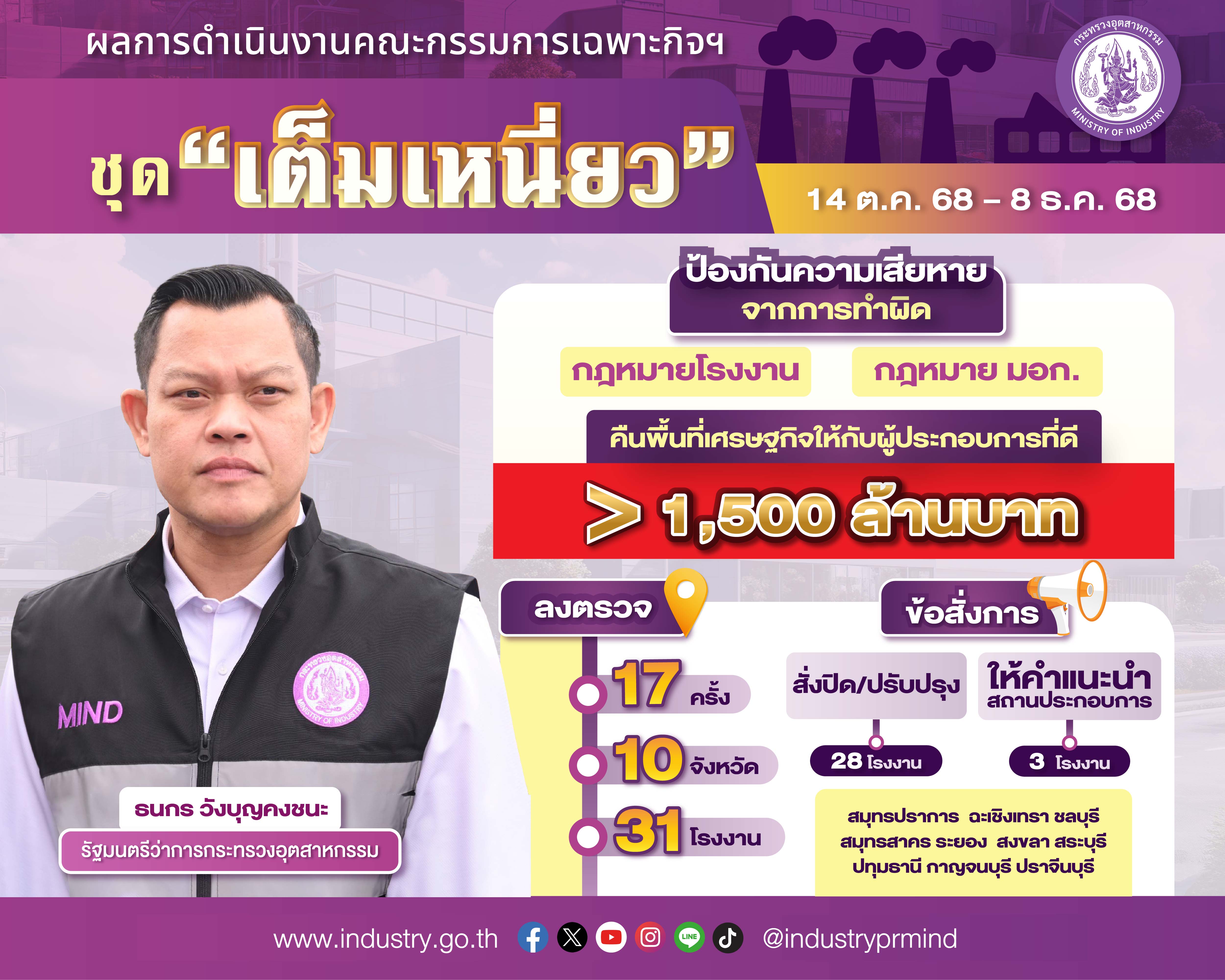 ผลงานกว่า 2 เดือนตามนโยบาย ฝ่า-ฟัน-ดึง-ดัน ได้ลงพื้นที่ - ตรวจสอบ - ดำเนินการทางกฎหมายอย่างเด็ดขาด แก้ไขปัญหาจากภาคอุตสาหกรรม ทำให้สิ่งแวดล้อมและความปลอดภัยดียิ่งขึ้น