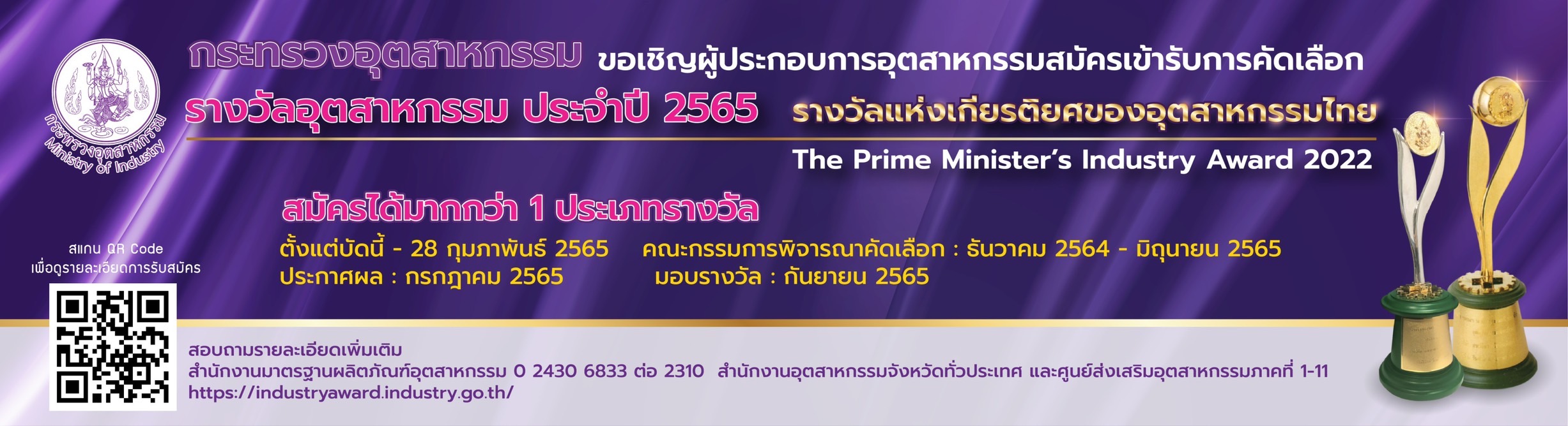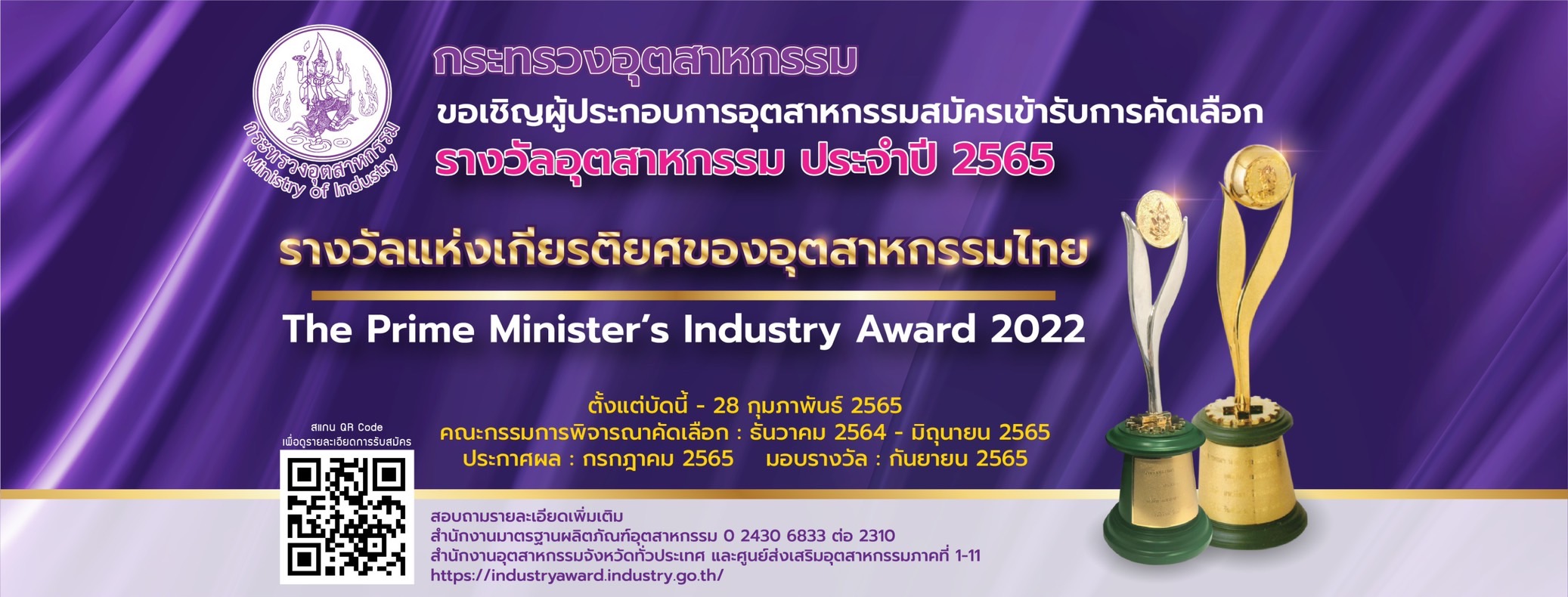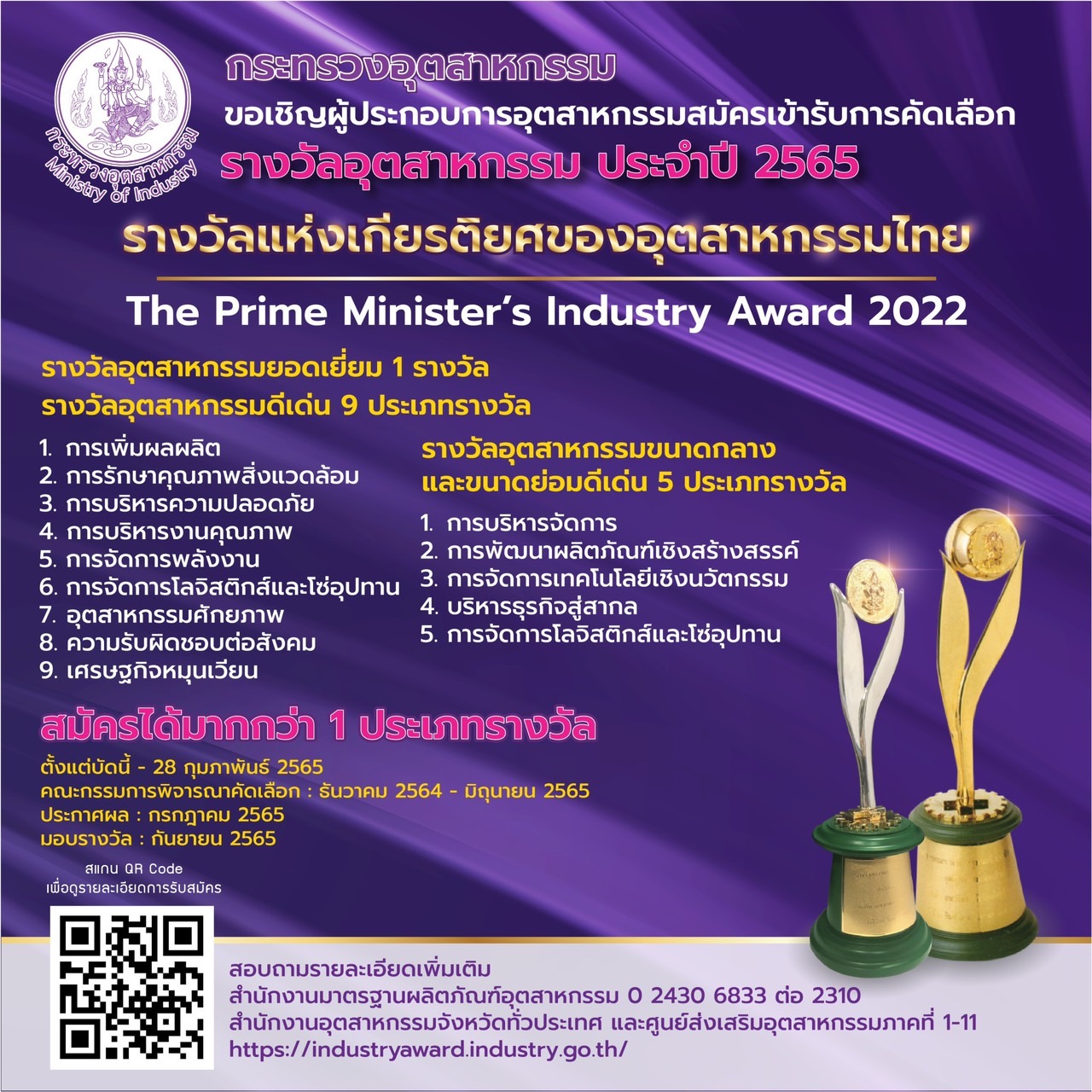 กระทรวงอุตสาหกรรม ขอเชิญผู้ประกอบการอุตสาหกรรมสมัครเข้ารับการคัดเลือก "รางวัลอุตสาหกรรม" ประจำปี 2565 รางวัลแห่งเกียรติยศของอุตสาหกรรมไทย (The Prime Minister's Industry Award 2022)