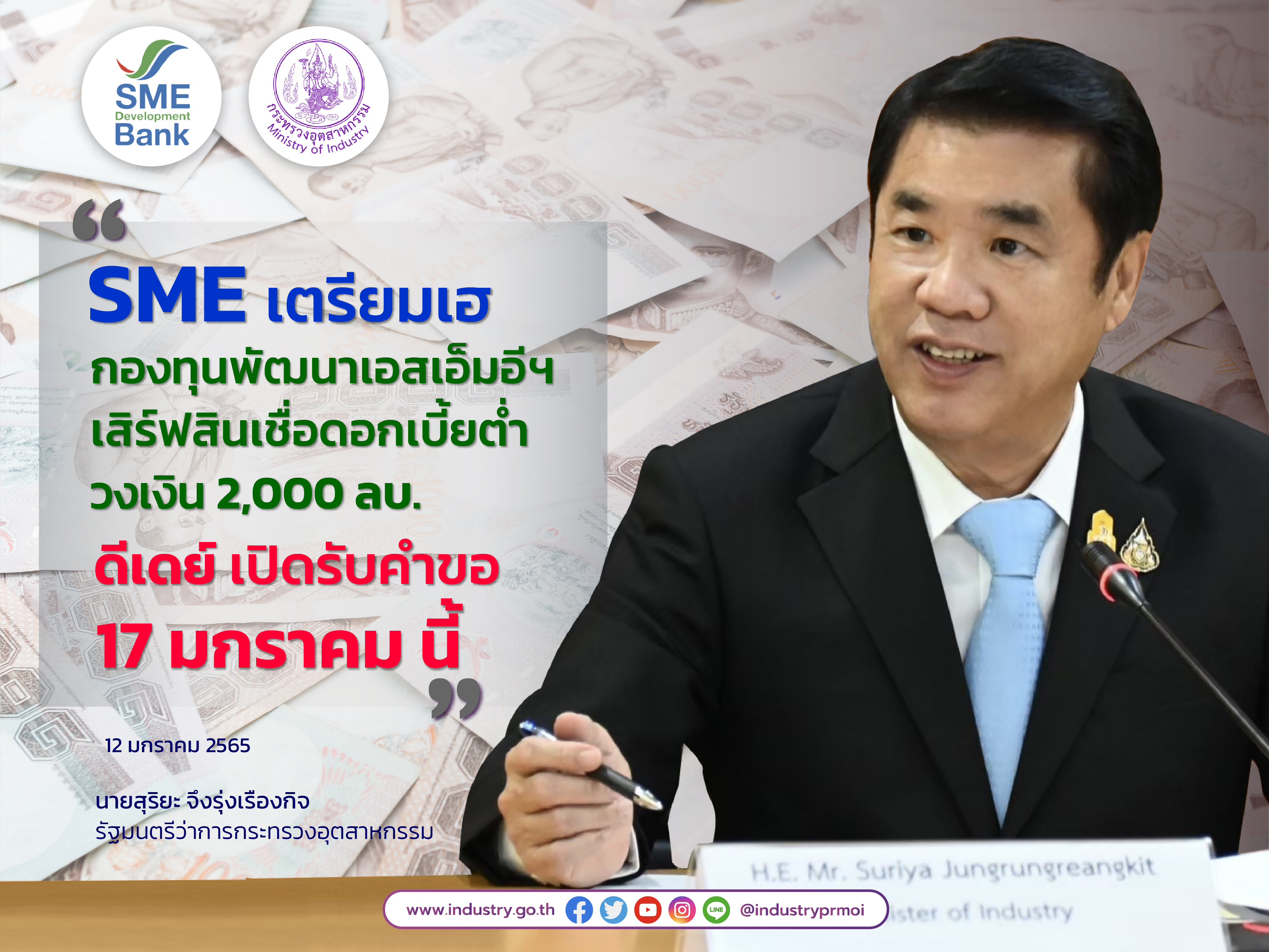 กระทรวงอุตสาหกรรม อัดงบประมาณสินเชื่อกองทุนพัฒนาเอสเอ็มอีตามแนวประชารัฐ 2,000 ล้านบาท จัดสินเชื่อดอกเบี้ยต่ำ 3 โครงการ พร้อมเปิดรับคำขอ 17 มกราคม 2565