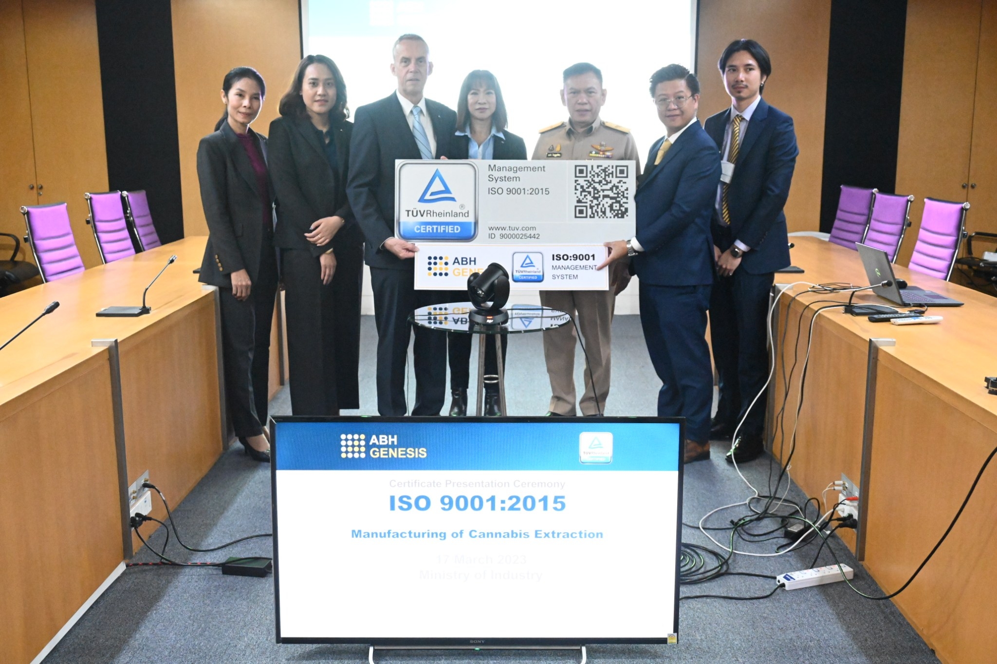 วันนี้ (17 มีนาคม 2566) นายสุชาติ ไตรแสงรุจิระ ที่ปรึกษารัฐมนตรีว่าการกระทรวงอุตสาหกรรม ได้แสดงความยินดีกับ บริษัท เอบีเอช เจนเนซิส จำกัด (ABHG) โรงงานผลิตสารสกัดจาก Cannabis ที่ได้รับเครื่องหมาย ISO 9001:2015 จาก TÜV Rheinland “รายแรกในเอเชียและในประเทศไทย” และเป็นโรงงานสกัดแรกที่ได้รับ GHP/WHO จาก BSI โดยมี นายอิทธิพัทธ์ ธรรมสุริยะ กรรมการ/Chief Technology Officer และ นายปภาวิชญ์ เกิดอุดม Chief Operating Officer บริษัท เอบีเอช เจนเนซิส จำกัด (ABHG) เป็นผู้รับมอบ และได้รับเกียรติจาก Mr.Stefan Heuer ตำแหน่ง Vice President ของ TÜV Rheinland จากสำนักงานใหญ่ประเทศเยอรมนี และ คุณพัชราวรรณ อิทธิสัทธากุล ผู้จัดการฝ่ายขายประจำภูมิภาคมาเป็นผู้มอบใบประกาศนียบัตรด้วยตนเอง