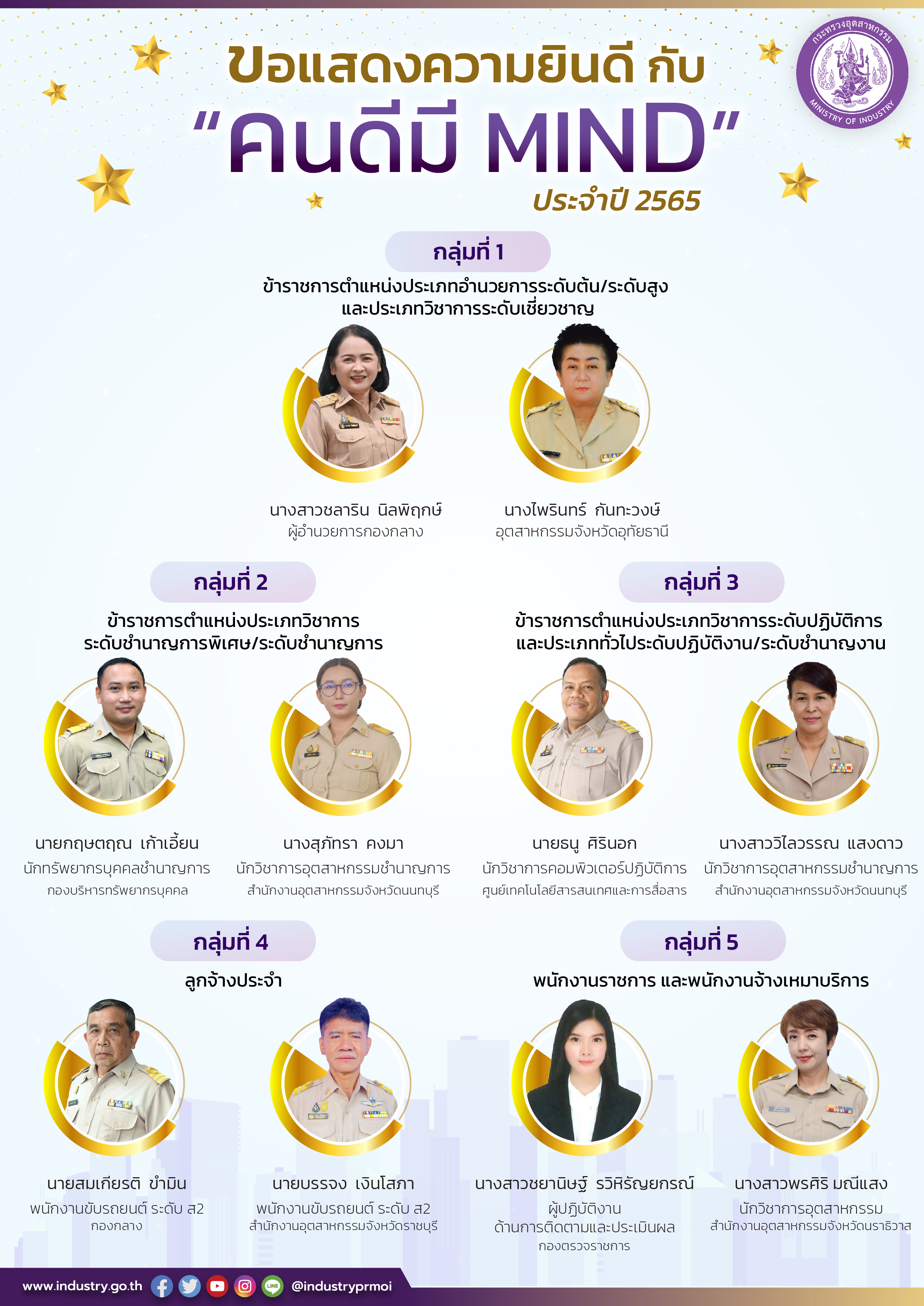 ขอแสดงความยินดี กับ "คนดีมี MIND" สำนักงานปลัดกระทรวงอุตสาหกรรม ประจำปี 2565
