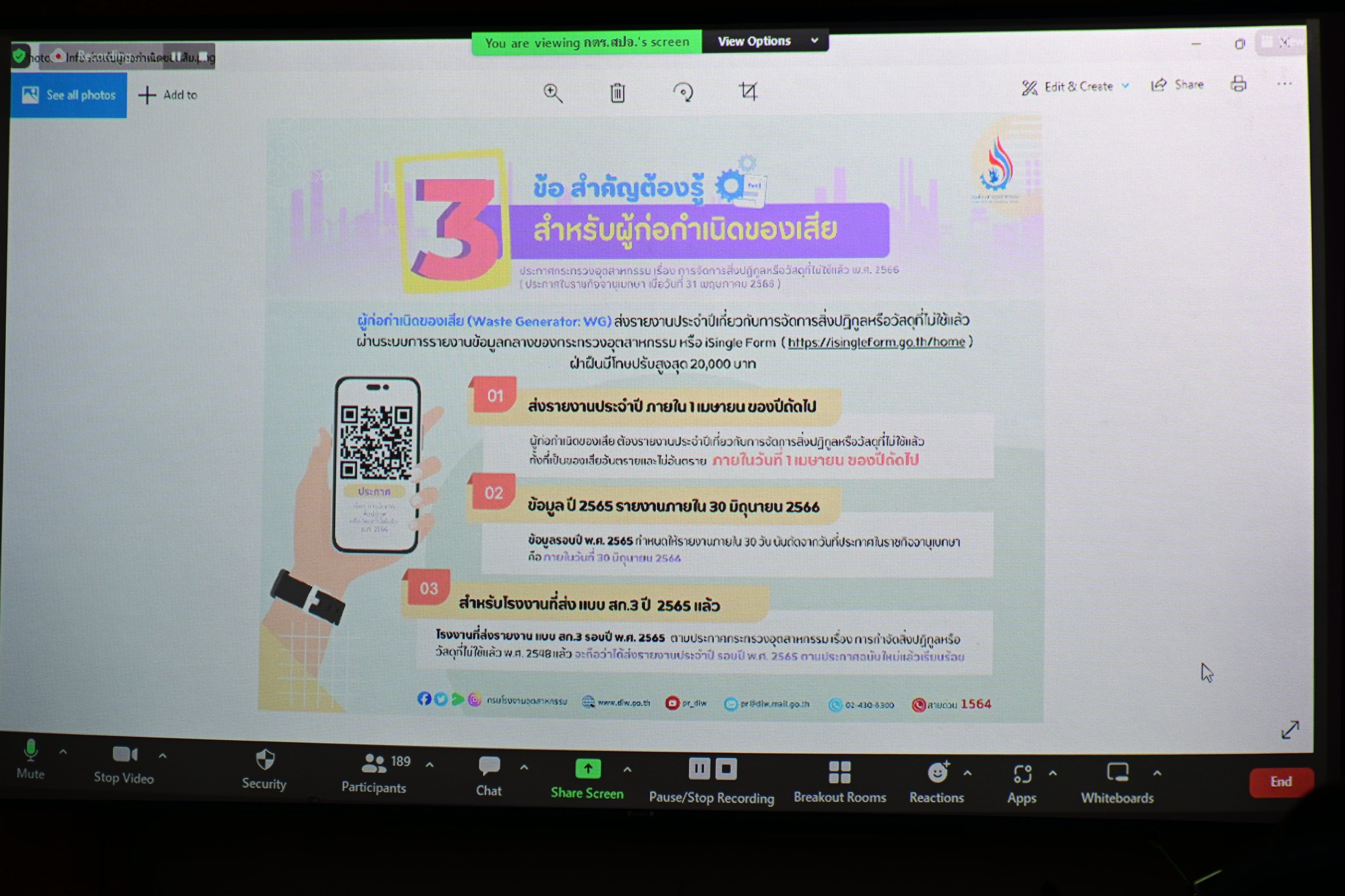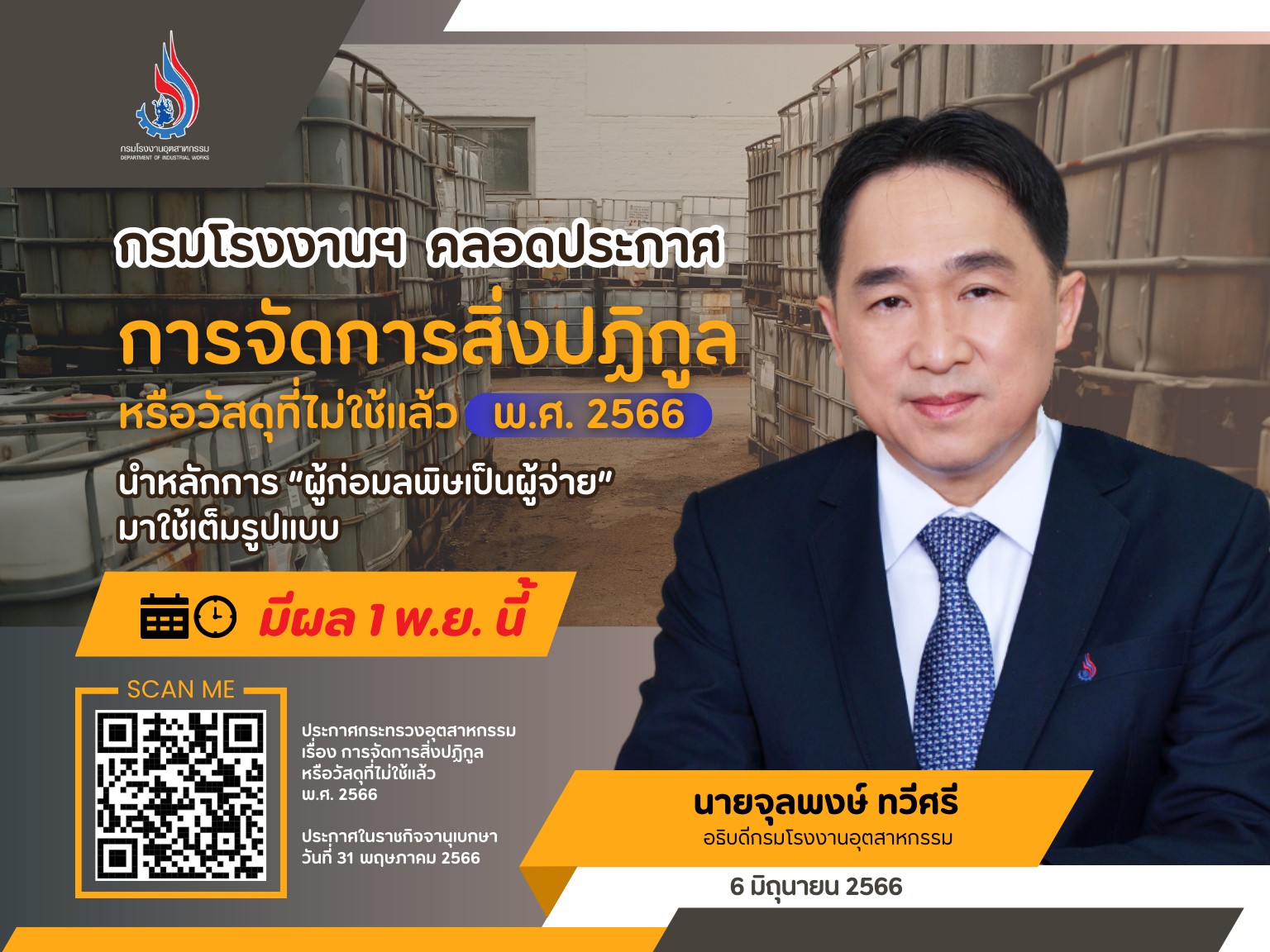 วันที่ 9 มิถุนายน 2566 นายวิษณุ ทับเที่ยง หัวหน้าผู้ตรวจราชการกระทรวงอุตสาหกรรม เป็นประธานการประชุมชี้แจงแนวทางการปฏิบัติตามประกาศกระทรวงอุตสาหกรรมฉบับล่าสุด เรื่อง “การจัดการสิ่งปฏิกูลหรือวัสดุที่ไม่ใช้แล้ว พ.ศ. 2566” ให้แก่ สำนักงานอุตสาหกรรมจังหวัด 76 จังหวัดทั่วประเทศ (สอจ.) ณ ห้องประชุมชุณหะวัน ชั้น 3 อาคารสำนักงานปลัดกระทรวงอุตสาหกรรม โดยมีนายเดชา จาตุธนานันท์ นายวีระกิตติ์ รันทกิจธนวิชญ์ นายทาวัน ทวีถาวรสวัสดิ์ นายภาสกร ชัยรัตน์ ผู้ตรวจราชการกระทรวงอุตสาหกรรม นางสาวณิรดา วิสุทธิชาติธาดา ผู้ช่วยปลัดกระทรวงอุตสาหกรรม นายวชิระ ไม้แพ ที่ปรึกษาด้านกฎหมาย นายสมชัย เอมบำรุง ผู้อำนวยการกองกฎหมาย นายเตมีย์ พันธุวงค์ราช ผู้อำนวยการกองตรวจราชการ สำนักงานปลัดกระทรวงอุตสาหกรรม นายธีรทัศน์ อิศรางกูร ณ อยุธยา ผู้อำนวยการศูนย์เทคโนโลยีสารสนเทศและการสื่อสาร และเจ้าหน้าที่กองบริหารจัดการกากอุตสาหกรรม กรมโรงงานอุตสาหกรรม