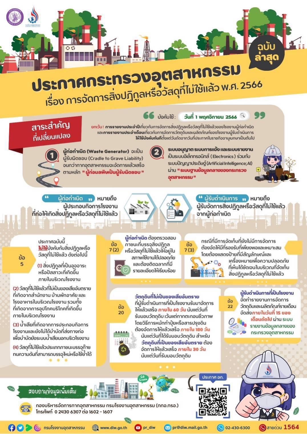การประชุมดังกล่าวเพื่อให้ สอจ. 76 จังหวัดได้รับทราบและถือปฏิบัติ เพื่อให้การจัดการสิ่งปฏิกูลหรือวัสดุที่ไม่ใช้แล้วให้เข้าสู่ระบบการจัดการที่ดี สร้างความเชื่อถือและความไว้วางใจจากประชาชนทั่วประเทศ โดยกรมโรงงานอุตสาหกรรม ได้ออกประกาศกระทรวงอุตสาหกรรมฉบับล่าสุด เรื่อง “การจัดการสิ่งปฏิกูลหรือวัสดุที่ไม่ใช้แล้ว พ.ศ. 2566” ที่นำหลักการ ผู้ก่อมลพิษเป็นผู้จ่ายหรือเป็นผู้รับผิดชอบ (Polluter Pays Principle: PPP) มาใช้อย่างเต็มรูปแบบ โดยมีผลบังคับใช้วันที่ 1 พฤศจิกายน 2566 ยกเว้น การส่งรายงานประจำปีเกี่ยวกับการจัดการสิ่งปฏิกูลหรือวัสดุที่ไม่ใช้แล้ว และรายงานประจำเดือนเกี่ยวกับการจัดการวัตถุดิบและผลิตภัณฑ์ ผ่านระบบการรายงานข้อมูลกลางของกระทรวงอุตสาหกรรม หรือ iSingle Form (https://isingleform.go.th/home) ซึ่งประกาศในราชกิจจานุเบกษา เมื่อวันที่ 31 พฤษภาคม 2566 และจะมีผลนับถัดจากวันที่ประกาศ ฝ่าฝืนไม่รายงานหรือรายงานล่าช้ามีโทษปรับสุงสุด 20,000 บาท