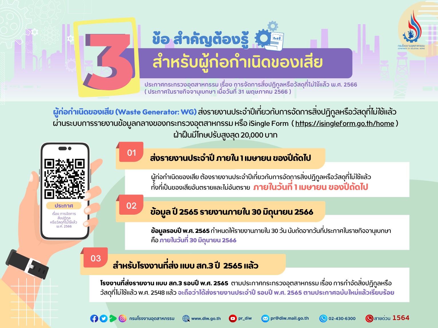 ผู้ก่อกำเนิดของเสีย (Waste Generator: WG) 60,638 โรงงานทั่วประเทศ เมื่อประกาศในราชกิจจานุเบกษาแล้ว ต้องรายงานประจำปีเกี่ยวกับการจัดการสิ่งปฏิกูลหรือวัสดุที่ไม่ใช้แล้ว ทั้งที่เป็นของเสียอันตรายและไม่อันตราย ภายในวันที่ 1 เมษายนของปีถัดไป โดยข้อมูลรอบปี พ.ศ. 2565 กำหนดให้รายงานภายใน 30 วัน นับถัดจากวันที่ประกาศในราชกิจจานุเบกษา คือ ภายในวันที่ 30 มิถุนายน 2566 สำหรับโรงงานที่ส่งรายงาน แบบ สก.3 รอบปี พ.ศ. 2565 ตามประกาศกระทรวงอุตสาหกรรม เรื่อง การกำจัดสิ่งปฏิกูลหรือวัสดุที่ไม่ใช้แล้ว พ.ศ. 2548 แล้ว จะถือว่าได้ส่งรายงานประจำปี รอบปี พ.ศ. 2565 ตามประกาศฉบับใหม่แล้วเรียบร้อย