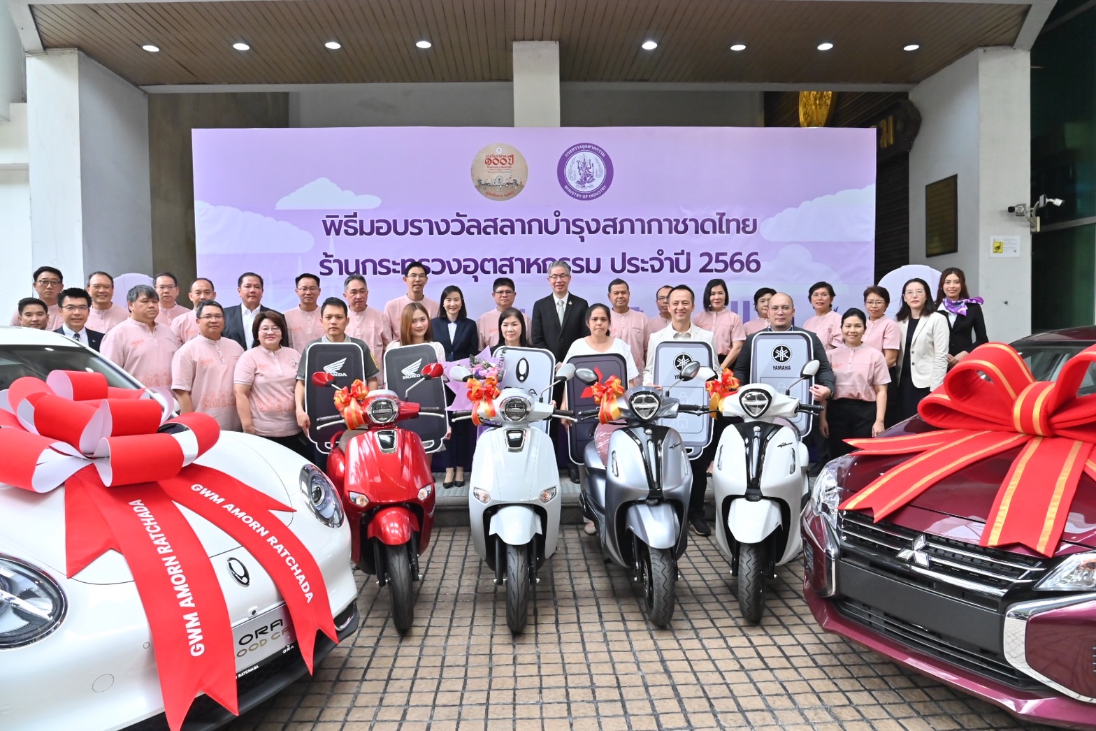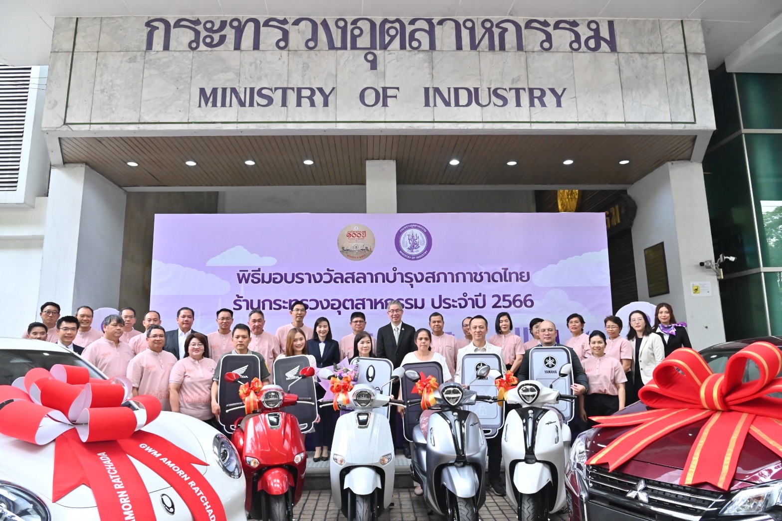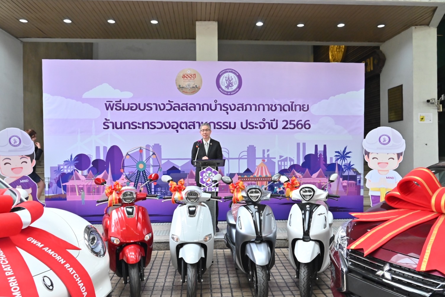 ปลัดฯ ณัฐพล กล่าวแสดงความยินดีกับผู้ได้รับรางวัล พร้อมกล่าวขอบคุณ ผู้สนับสนุนของรางวัล อาทิ บริษัท เกรท วอล มอเตอร์ , SMEs D Bank และหน่วยงานอื่นที่ร่วมให้การสนับสนุนของรางวัลของร้านกระทรวงอุตสาหกรรม โดยรายได้ทั้งหมดจากการจัดกิจกรรมภายในร้านของกระทรวงอุตสาหกรรม หลังจากหักค่าใช้จ่ายที่จำเป็นแล้ว จะนำขึ้นทูลเกล้าฯ โดยเสด็จพระราชกุศล และเพื่อบำรุงสภากาชาดไทย เพื่อนำไปใช้ในโครงการต่างๆที่เป็นสาธารณประโยชน์ต่อไป สำหรับรางวัลสลากบำรุงสภากาชาดไทย ร้านกระทรวงอุตสาหกรรม ประจำปี 2566 ที่ได้ทำพิธีมอบในวันนี้ (30 ม.ค.67) มีทั้งสิ้น 6 รางวัล ประกอบด้วย รางวัลที่ 1 รถยนต์ รุ่น ORA GOODCAT รางวัลที่ 2 รถยนต์ MITSUBISHI MIRAGE รางวัลที่ 3 รถจักรยานยนต์ HONDA GIORNO +125 จำนวน 2 คัน และรถจักรยานยนต์ YAMAHA GRAND FILANI HYBRID จำนวน 2 คัน