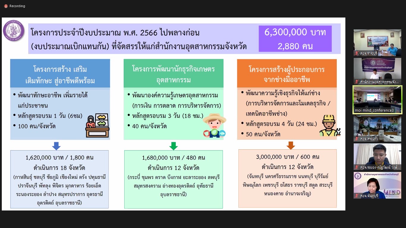 วันที่ 1 กุมภาพันธ์ 2567 นางสาวณัฏฐิญา เนตยสุภา รองปลัดกระทรวงอุตสาหกรรม เป็นประธานการประชุมชี้แจงแนวทางการดำเนินโครงการ/กิจกรรม งบประมาณรายจ่ายประจำปีงบประมาณ พ.ศ. 2566 ไปพลางก่อน (งบประมาณเบิกแทนกัน) เพื่อรายงานผลการสำรวจความต้องการของ สำนักงานอุตสาหกรรมจังหวัด ในการส่งเสริมและพัฒนากลุ่มเป้าหมายในพื้นที่ และพิจารณาโครงการประจำปีงบประมาณ พ.ศ. 2566 ไปพลางก่อน (งบประมาณเบิกแทนกัน) ที่จัดสรรให้แก่สำนักงานอุตสาหกรรมจังหวัด สำหรับใช้ในการดำเนินโครงการต่าง ๆ โดยมีนายวิษณุ ทับเที่ยง หัวหน้าผู้ตรวจราชการกระทรวงอุตสาหกรรม นายพลาวุธ วงศ์วิวัฒน์ ผู้อำนวยการกองยุทธศาสตร์และแผนงาน นายเตมีย์ พันธุวงค์ราช ผู้อำนวยการกองตรวจราชการ นางสาวชลาริน นิลพิฤกษ์ ผู้อำนวยการกองกลาง เข้าร่วมประชุม ณ ห้องประชุม อก.1 ชั้น 2 อาคารสำนักงานปลัดกระทรวงอุตสาหกรรม และผ่านสื่ออิเล็กทรอนิกส์ (Zoom Meeting)