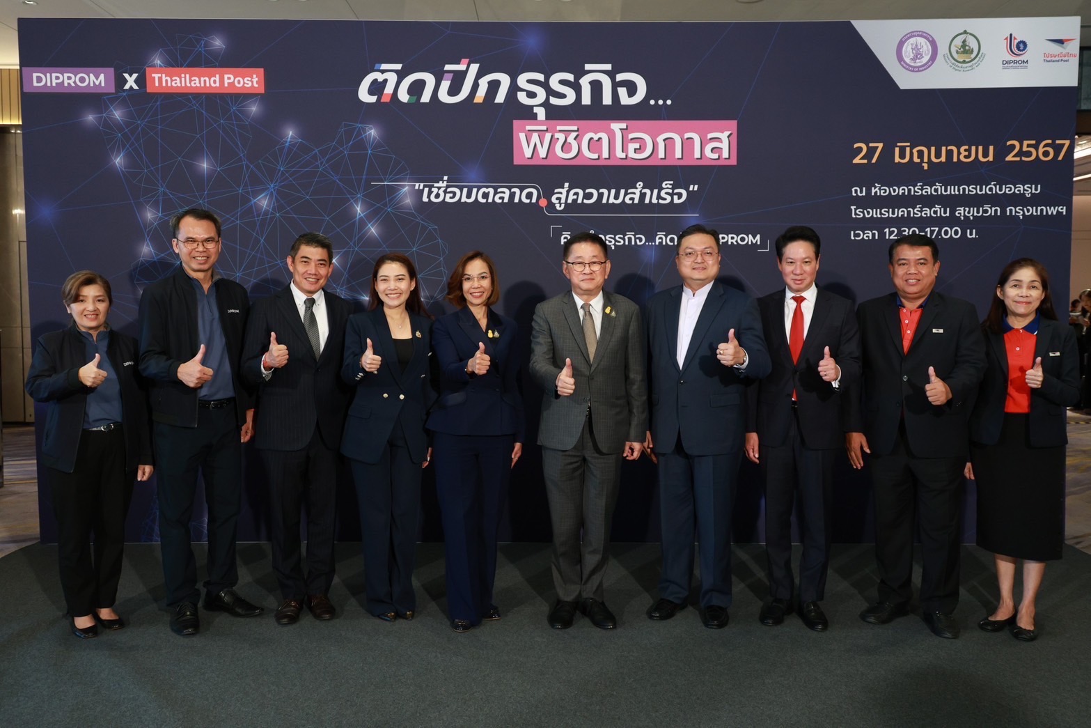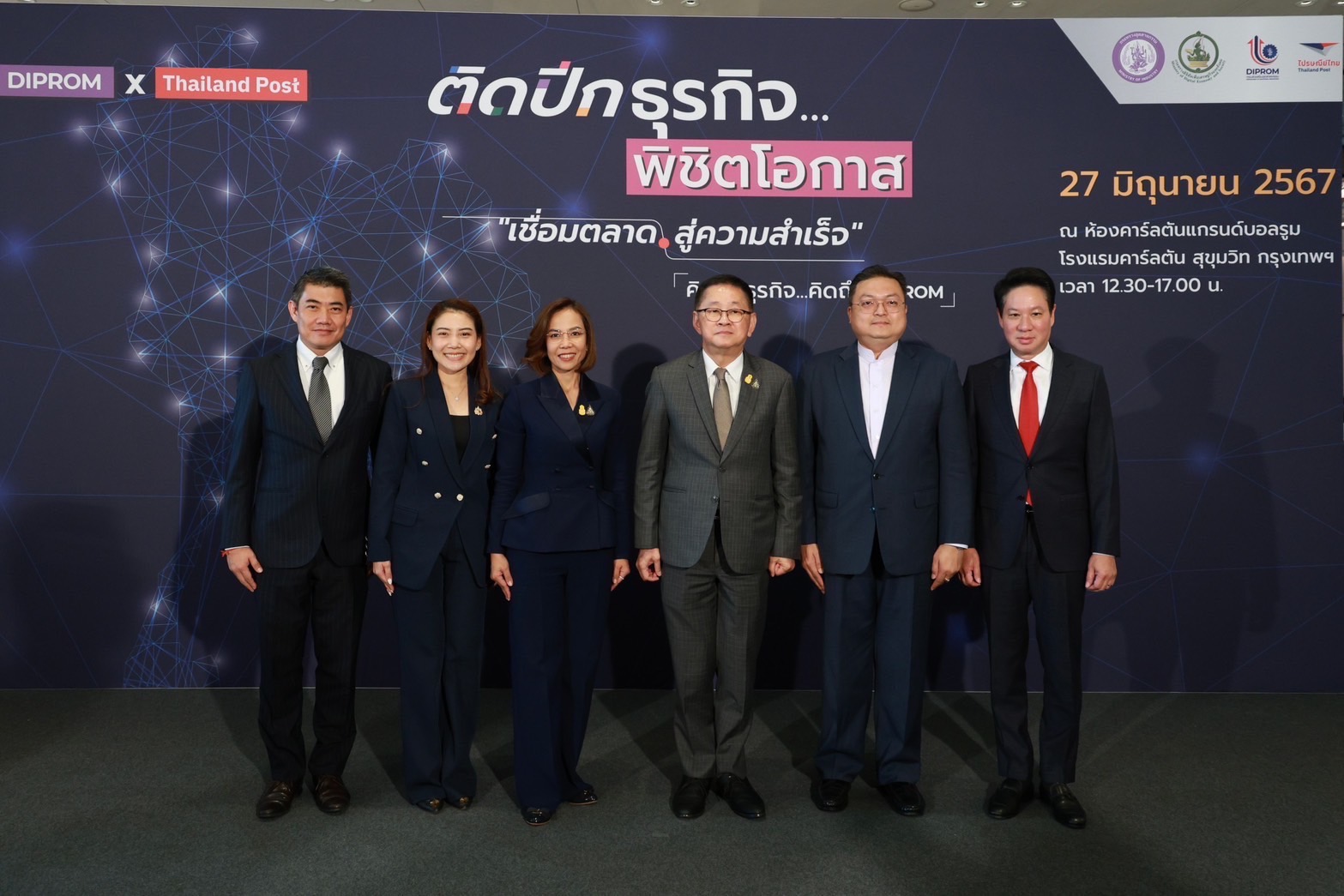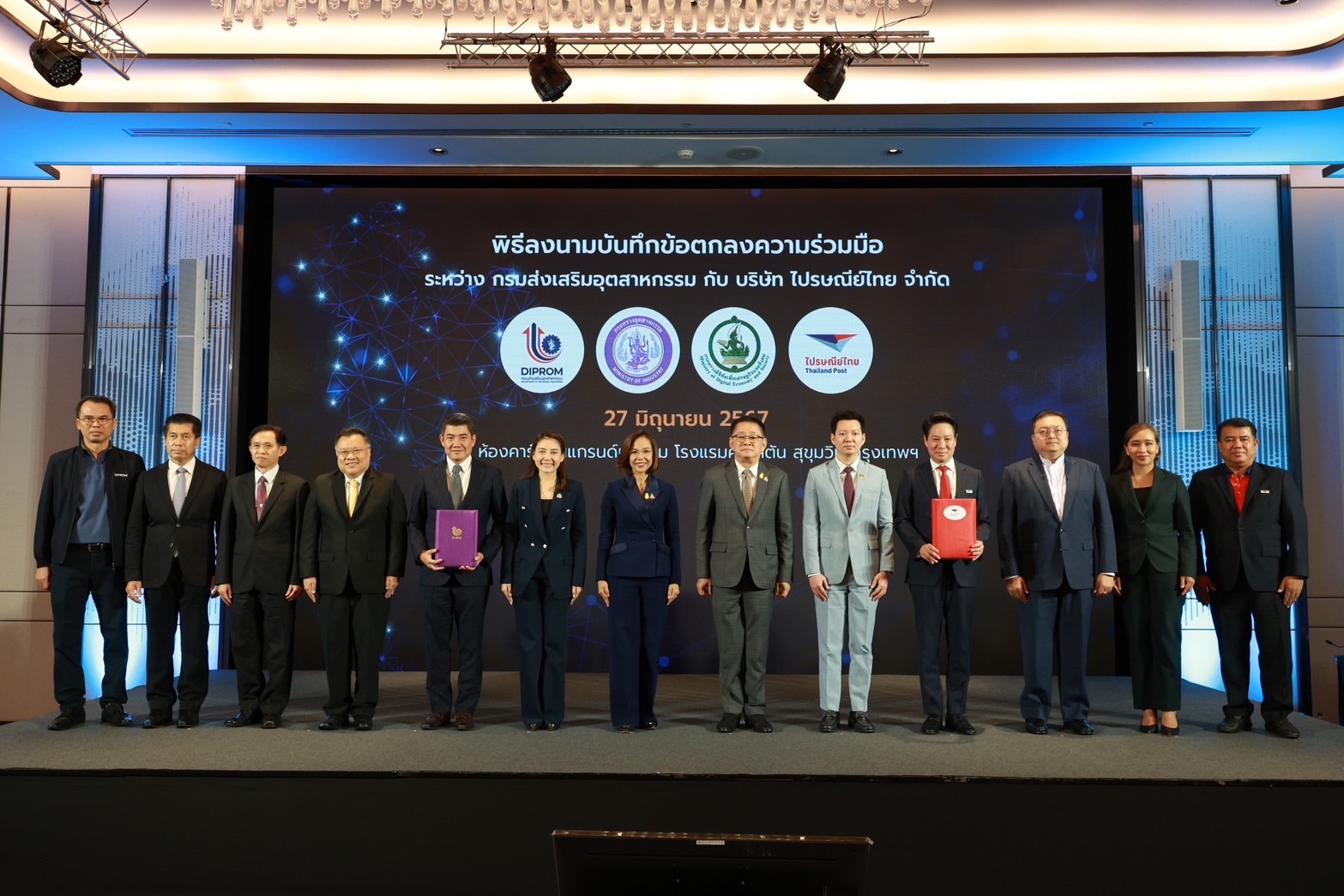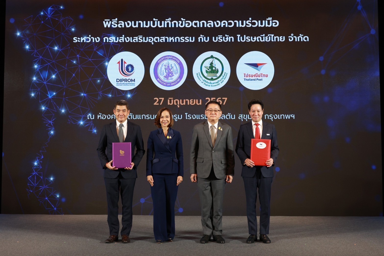 กรุงเทพฯ 27 มิถุนายน 2567 - นางสาวพิมพ์ภัทรา วิชัยกุล รัฐมนตรีว่าการกระทรวงอุตสาหกรรม กล่าวแสดงความยินดีในพิธีลงนามในบันทึกข้อตกลงความร่วมมือ (MOU) “การพัฒนาศักยภาพและสร้างโอกาสทางการตลาดเพื่อยกระดับขีดความสามารถวิสาหกิจไทยอย่างยั่งยืน” ระหว่างกรมส่งเสริมอุตสาหกรรม หรือ ดีพร้อม (DIPROM) กระทรวงอุตสาหกรรม บริษัท ไปรษณีย์ไทย จำกัด และกระทรวงดิจิทัลเพื่อเศรษฐกิจและสังคม โดยมีนายประเสริฐ จันทรรวงทอง รัฐมนตรีว่าการกระทรวงดิจิทัลเพื่อเศรษฐกิจและสังคม นายภาสกร ชัยรัตน์ อธิบดีกรมส่งเสริมอุตสาหกรรม ดร.ดนันท์ สุภัทรพันธุ์ กรรมการผู้จัดการใหญ่ บริษัท ไปรษณีย์ไทย จำกัด ร่วมลงนามในบันทึกข้อตกลงความร่วมมือฯ และมีนางสาวไพลิน เทียนสุวรรณ เลขานุการรัฐมนตรีว่าการกระทรวงอุตสาหกรรม ร่วมเป็นเกียรติด้วย