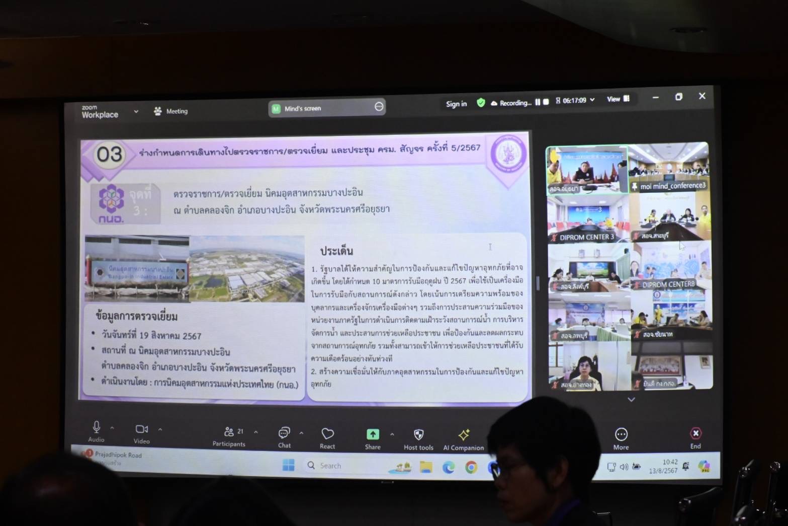 ที่ประชุมได้แจ้งประเด็นการตรวจราชการสำคัญของคณะรัฐมนตรีอย่างเป็นทางการนอกสถานที่ ครั้งที่ 5/2567 กลุ่มจังหวัดภาคกลางตอนบน (จังหวัดพระนครศรีอยุธยา ชัยนาท ลพบุรี สระบุรี สิงห์บุรี และอ่างทอง) ที่จะมีขึ้นในวันที่ 19-20 สิงหาคม 2567 ณ จังหวัดพระนครศรีอยุธยา ดังนี้ 1) การสร้างฐานการผลิตสินค้าเกษตร อาหาร เพื่อสุขภาพมูลค่าสูงที่เป็นมิตรกับสิ่งแวดล้อม 2) การยกระดับการท่องเที่ยวมูลค่าสูงด้วยเทคโนโลยีและนวัตกรรมบนพื้นฐานของการท่องเที่ยวอย่างรับผิดชอบ 3) การเพิ่มมูลค่าห่วงโซ่อุปทานอุตสาหกรรมและบริการในอนาคต 4) การจัดการทรัพยากรธรรมชาติ สิ่งแวดล้อม และพลังงาน แบบมีส่วนร่วมอย่างยั่งยืน 5) การส่งเสริมการพัฒนาภาคอุตสาหกรรมในพื้นที่ 6 ) การบริหารจัดการน้ำอย่างเป็นระบบเพื่อแก้ไขปัญหาอุทกภัยและภัยแล้ง และได้นำเสนอร่างกำหนดการเดินทางไปตรวจราชการและตรวจเยี่ยมของกระทรวงอุตสาหกรรม และสถานที่ นำเสนอรัฐมนตรีว่าการกระทรวงอุตสาหกรรมพิจารณาต่อไป