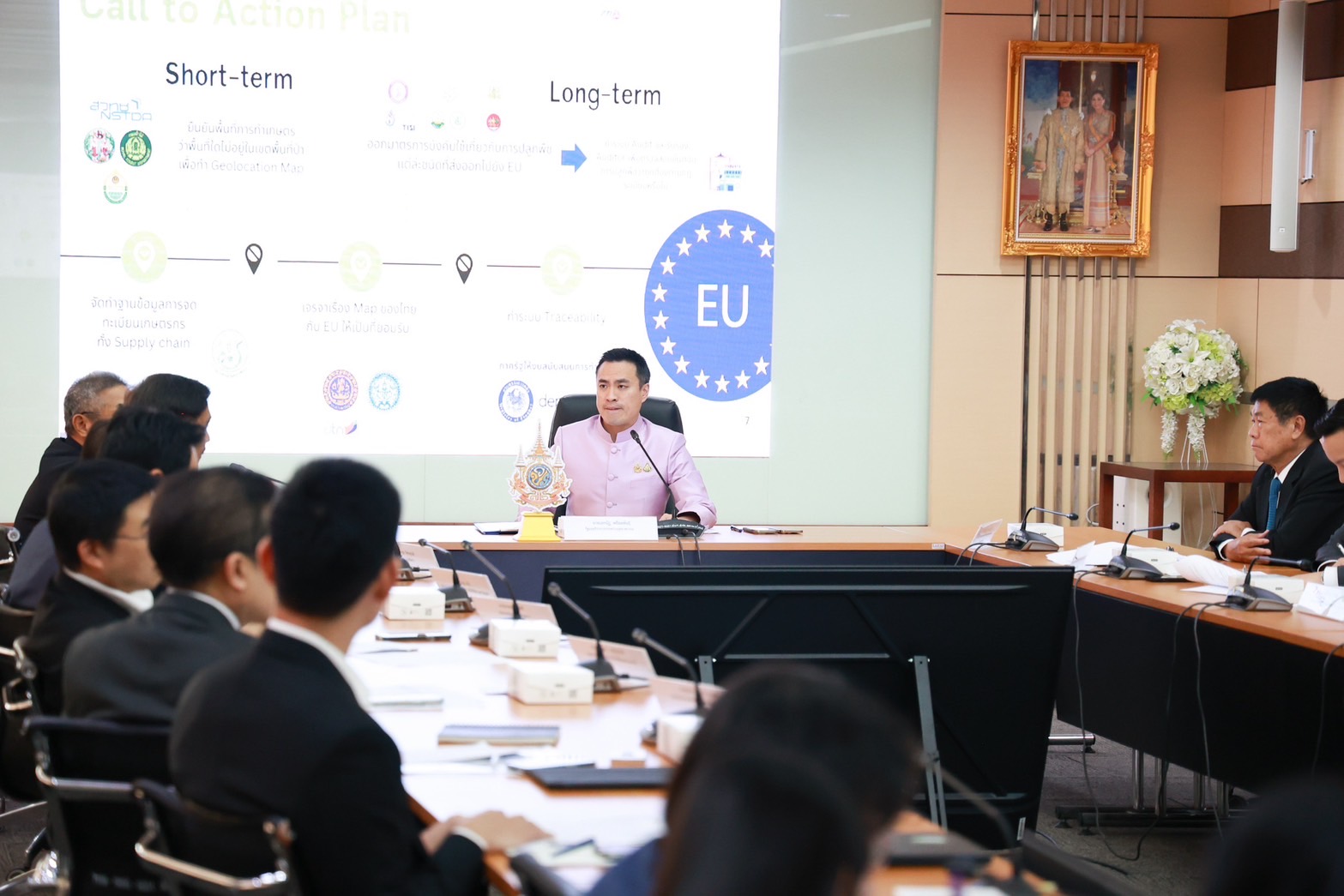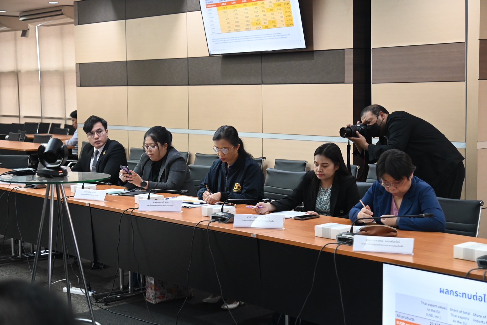 สำหรับวัตถุประสงค์การหารือในครั้งนี้ เพื่อเป็นการหาแนวทางการส่งเสริมและสนับสนุนผู้ประกอบการภายใต้กฎหมาย EU Deforestation-free Product Regulation: EUDR (กฎหมายว่าด้วยการนำเข้าและส่งออกสินค้าที่มีความเกี่ยวข้องกับการตัดไม้ทำลายป่าและความเสื่อมโทรมของป่า) ซึ่งเป็นกฎหมายสินค้าปลอดการตัดไม้ทำลายป่า โดยกำหนดให้ส่งออกและนำเข้าสินค้าโภคภัณฑ์ 7 กลุ่มของ EU ได้แก่ ยางพารา ปาล์มน้ำมัน วัว ไม้ กาแฟ โกโก้ และถั่วเหลือง รวมถึงผลิตภัณฑ์ที่แปรรูปจากสินค้าเหล่านี้ ต้องดำเนินการตรวจสอบสถานะและรายงานที่มาของสินค้า เพื่อให้ความมั่นใจว่าสินค้าและผลิตภัณฑ์ที่วางจำหน่ายไม่ได้มาจากการตัดไม้ทำลายป่า