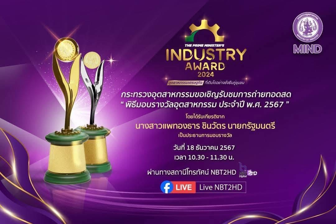 กระทรวงอุตสาหกรรม ขอเชิญรับชมการถ่ายทอดสด พิธีมอบรางวัลอุตสาหกรรม ประจำปี พ.ศ. 2567 (The Prime Minister’s Industry Award 2024)