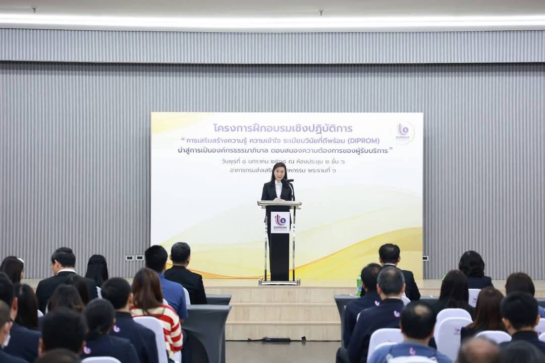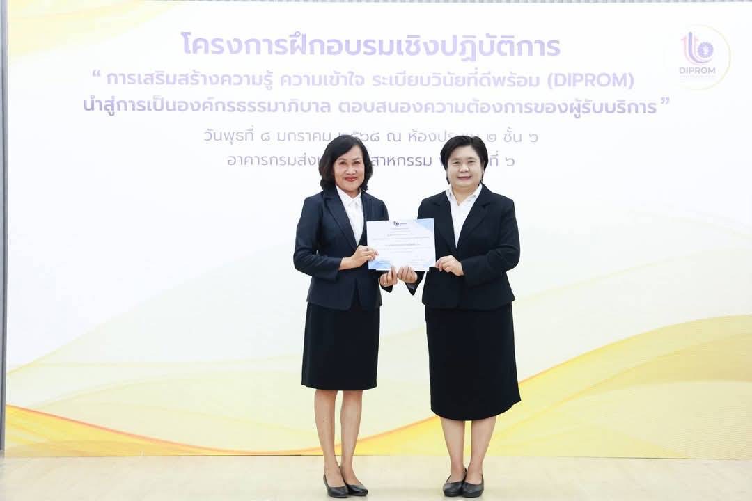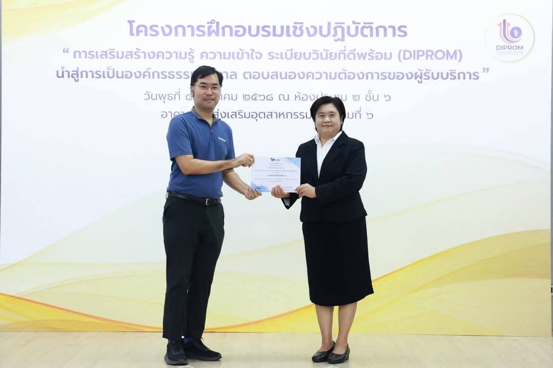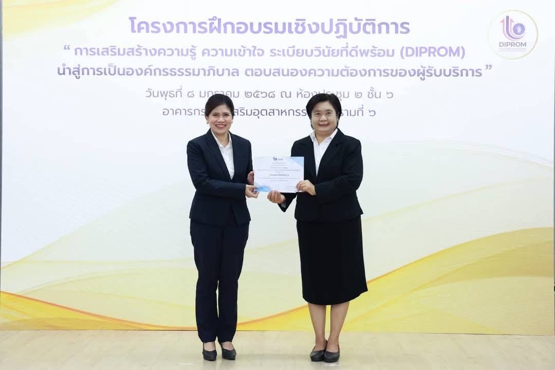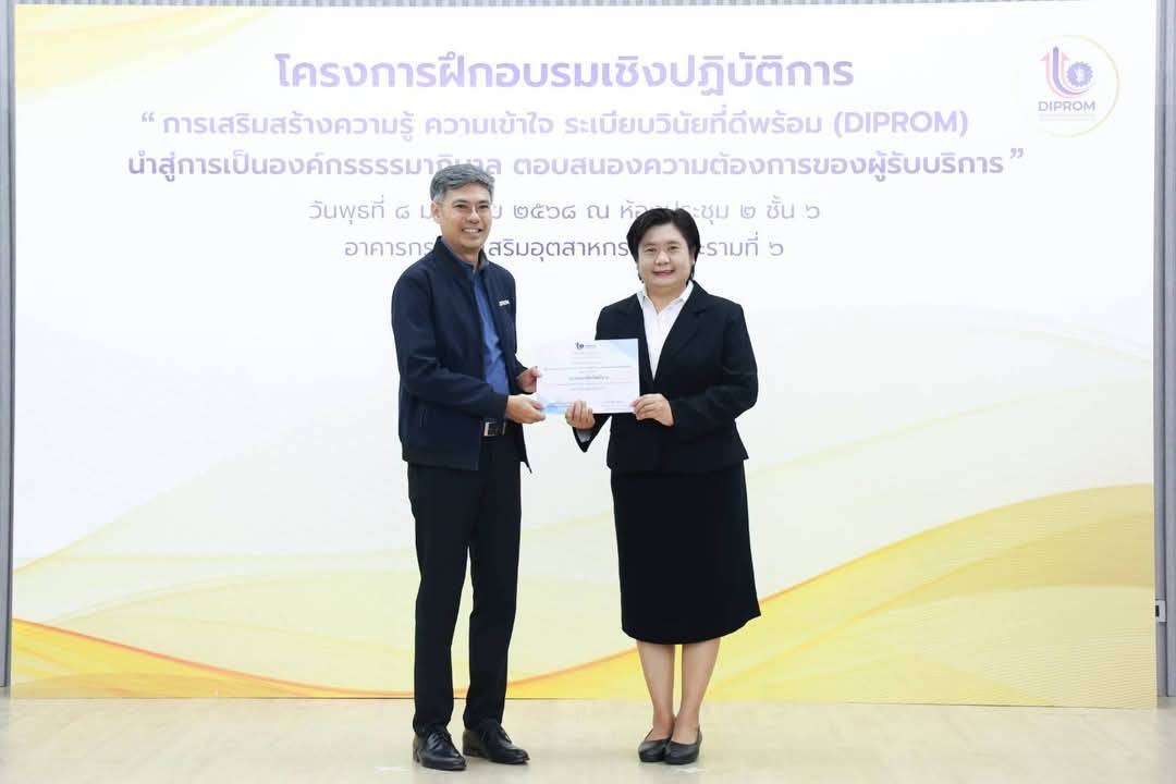 โครงการฝึกอบรมเชิงปฏิบัติการ หลักสูตรการเสริมสร้างความรู้ ความเข้าใจ ระเบียบวินัยที่ดีพร้อม (DIPROM) นำสู่การเป็นองค์กรธรรมาภิบาล ตอบสนองความต้องการของผู้รับบริการ มีวัตถุประสงค์เพื่อให้ผู้เข้าอบรมมีความรู้ ความเข้าใจเกี่ยวกับกฎหมาย กฎ และระเบียบของทางราชการที่กำหนดไว้เป็นหลักและแบบแผนความประพฤติให้สามารถปฏิบัติตนและปฏิบัติราชการได้อย่างถูกต้อง มีคุณธรรมจริยธรรม ซื่อสัตย์ สุจริต โปร่งใส และตรวจสอบได้ พร้อมทั้งให้บริการด้วยหัวใจ อันจะก่อให้เกิดประสิทธิภาพและประสิทธิผลแก่ทางราชการ นอกจากนี้ ยังเน้นย้ำให้เจ้าหน้าที่ดีพร้อมใช้ธรรมมาภิบาลและยึดวินัยข้าราชการที่ดีในการปฏิบัติราชการ เพื่อให้สามารถปฏิบัติงานสอดรับตามนโยบาย “ปฏิรูปอุตสาหกรรมไทยสู่เศรษฐกิจยุคใหม่ ทันสมัย สะอาด สะดวก โปร่งใส” ของ นายเอกนัฏ พร้อมพันธุ์ รัฐมนตรีว่าการกระทรวงอุตสาหกรรม