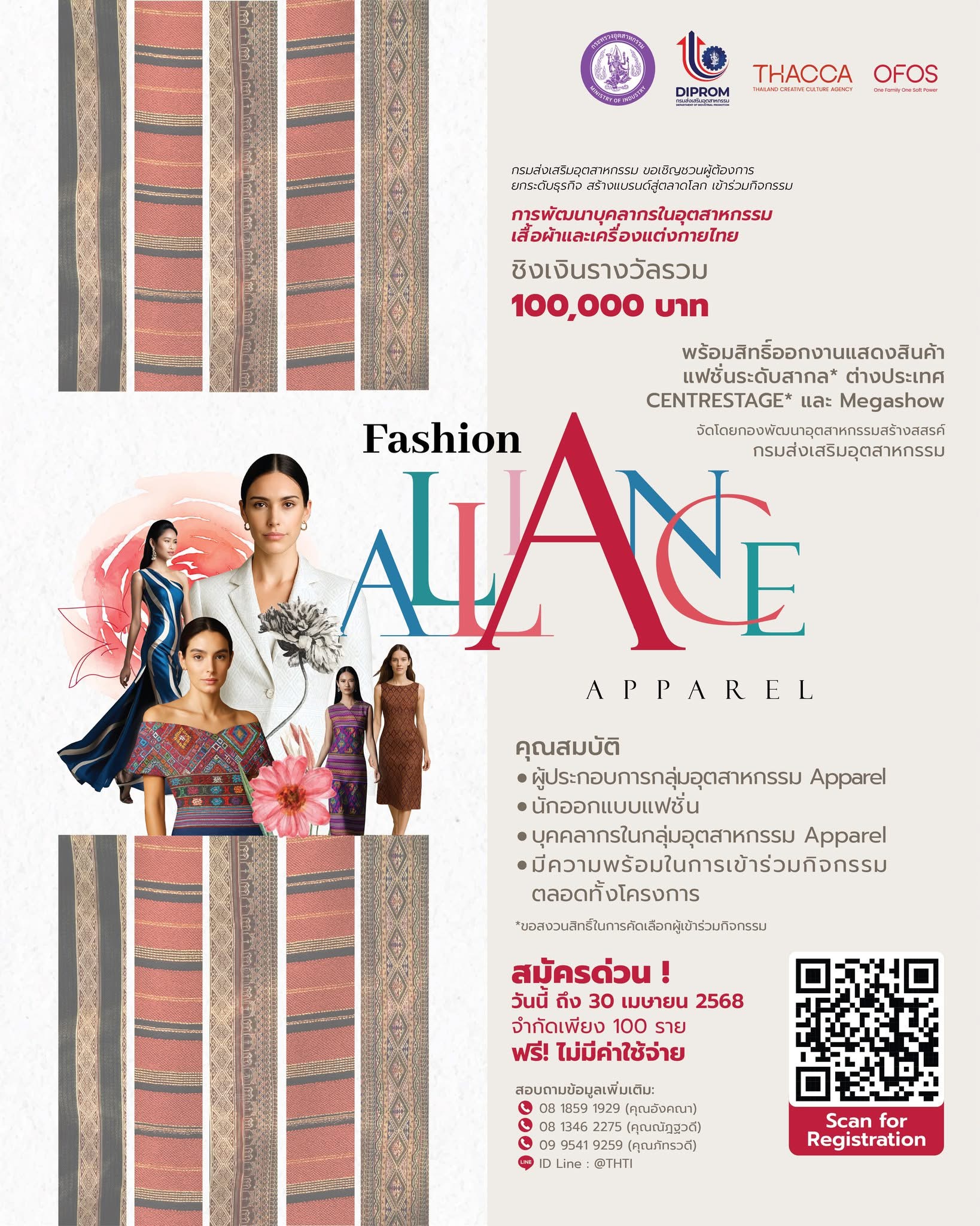 ขอเชิญท่านสมัครเข้าร่วมกิจกรรมพัฒนาบุคลากรในอุตสาหกรรมเสื้อผ้าและเครื่องแต่งกายไทย (Soft Power Fashion Apparel Alliance) ภายใต้โครงการ พัฒนาและเชื่มโยงเครือข่ายบุคลากรอุตสาหกรรมแฟชั่น (Fashion Alliance) เพื่อเตรียมความพร้อมออกงานแสดงสินค้าทั้งในและต่างประเทศ และเป็นส่วนหนึ่งในการขับเคลื่อนซอฟต์พาวเวอร์ไทยสู่สากล