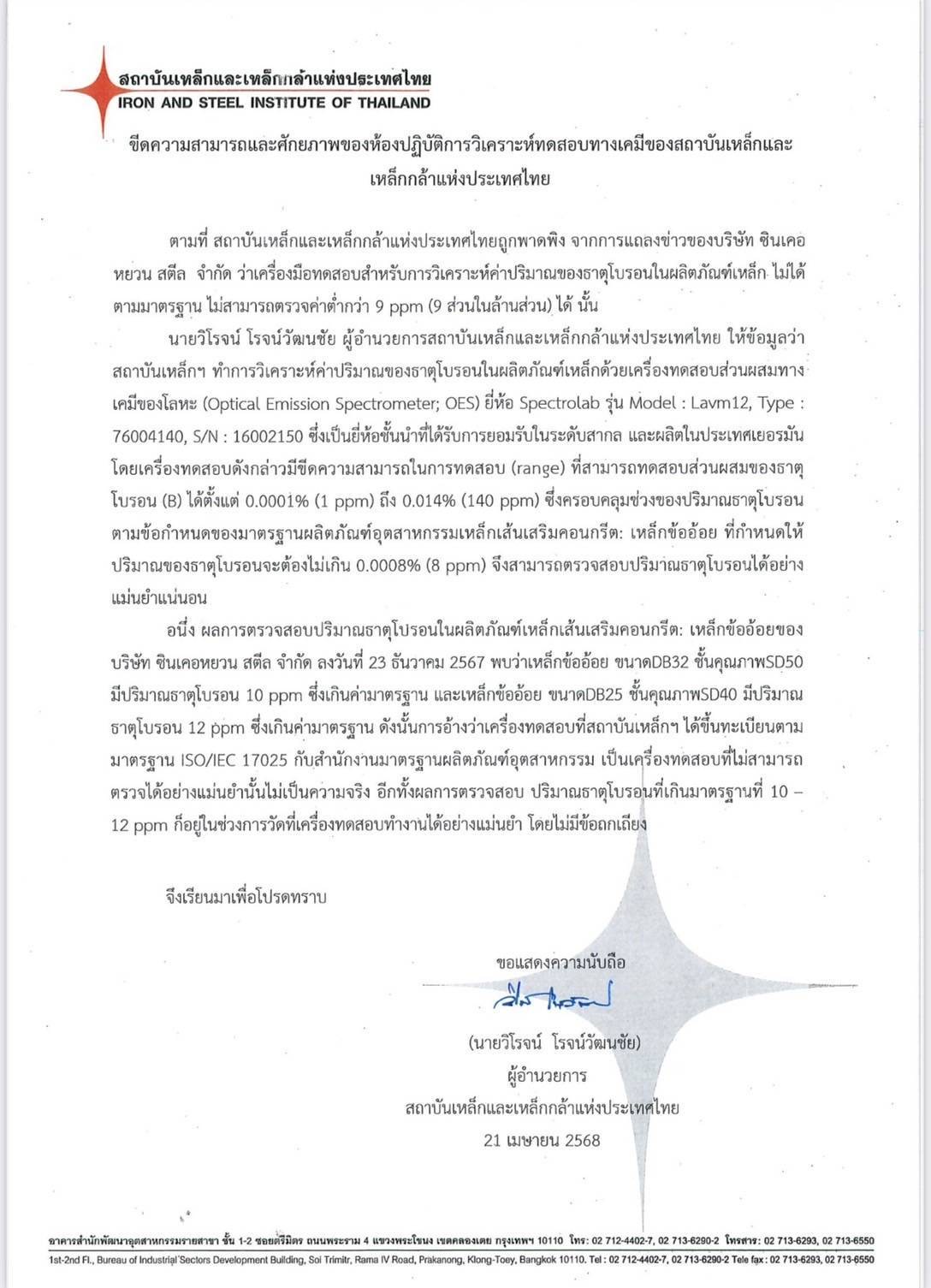 อนึ่ง ผลการตรวจสอบปริมาณธาตุโปรอนในผลิตภัณฑ์เหล็กเส้นเสริมคอนกรีต: เหล็กข้ออ้อยของ บริษัท ซินเคอหยวน สตีล จำกัด ลงวันที่ 23 ธันวาคม 2567 พบว่าเหล็กข้ออ้อย ขนาด DB32 ชั้นคุณภาพSD5D50 มีปริมาณธาตุโบรอน 10 ppm ซึ่งเกินค่ามาตรฐาน และเหล็กข้ออ้อย ขนาด DB25 ชั้นคุณภาพ SD40 มีปริปริมาณ ธาตุโบรอน 12 ppm ซึ่งเกินค่ามาตรฐาน ดังนั้นการอ้างว่าเครื่องทดสอบที่สถาบันเหล็กฯ ได้ขึ้นทะเบียนตามมาตรฐาน ISO/IEC 17025 กับสำนักงานมาตรฐานผลิตภัณฑ์อุตสาหกรรม เป็นเครื่องทดสอบที่ไม่สามารถตรวจได้อย่างแม่นยำนั้นไม่เป็นความจริง อีกทั้งผลการตรวจสอบ ปริมาณธาตุโบรอนที่เกินมาตรฐานที่ 10 -12 ppm ก็อยู่ในช่วงการวัดที่เครื่องทดสอบทำงานได้อย่างแม่นยำ โดยไม่มีข้อถกเถียง