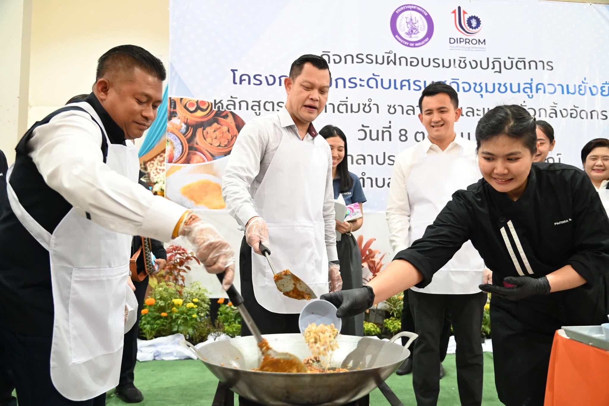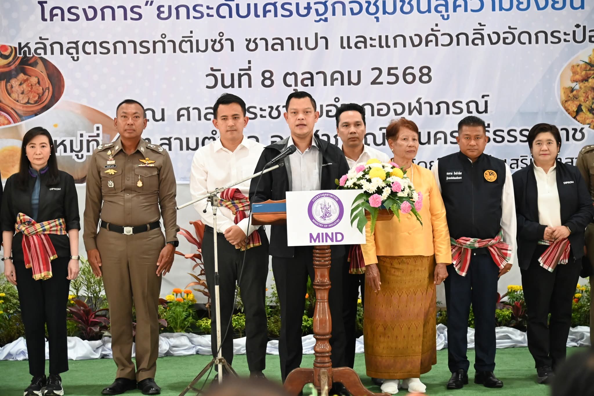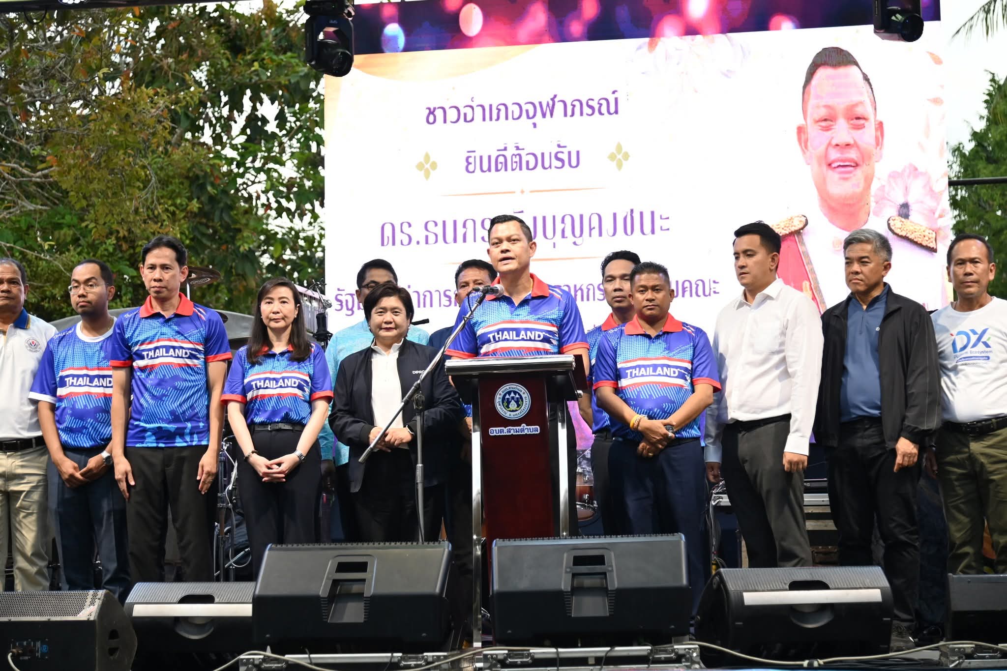 ต่อมาเวลา 13.30 น. นายธนกรร่วมพิธีเปิดกิจกรรมฝึกอบรมเชิงปฏิบัติการ โครงการ “ยกระดับเศรษฐกิจชุมชนสู่ความยั่งยืน” ประจำปีงบประมาณ พ.ศ. 2569 ณ ศาลาประชาคมอำเภอจุฬาภรณ์ หมู่ที่ 4 ตำบลสามตำบล อำเภอจุฬาภรณ์ จังหวัดนครศรีธรรมราช โดยนายธนกร กล่าวช่วงหนึ่งว่า โครงการ “ยกระดับเศรษฐกิจชุมชนสู่ความยั่งยืน” เป็นอีกหนึ่งภารกิจสำคัญของกระทรวงอุตสาหกรรม ในการขับเคลื่อนเศรษฐกิจฐานรากให้เข้มแข็ง มีรายได้มั่นคง และสามารถเติบโตได้ด้วยศักยภาพของตนเอง โครงการนี้คือการสร้างโอกาสให้ชุมชนได้เรียนรู้ ลงมือทำจริง และนำองค์ความรู้ไปต่อยอดเป็นธุรกิจที่ยั่งยืน ทั้งในด้านการผลิต การตลาด การบริหารจัดการ และการใช้เทคโนโลยี เพื่อให้เศรษฐกิจชุมชนของไทยเติบโตอย่างมั่นคงจากฐานรากอย่างแท้จริง สอดคล้องกับนโยบายของรัฐบาล ที่มุ่งสร้างเศรษฐกิจเข้มแข็งจากฐานราก เพิ่มรายได้ ลดความเหลื่อมล้ำ และสร้างโอกาสให้ประชาชนทุกกลุ่มเข้าถึงการพัฒนาอย่างเท่าเทียม เพื่อให้เศรษฐกิจฐานรากของไทยเติบโตอย่างมั่นคง และเป็นพลังสำคัญในการขับเคลื่อนเศรษฐกิจของประเทศในระยะยาว