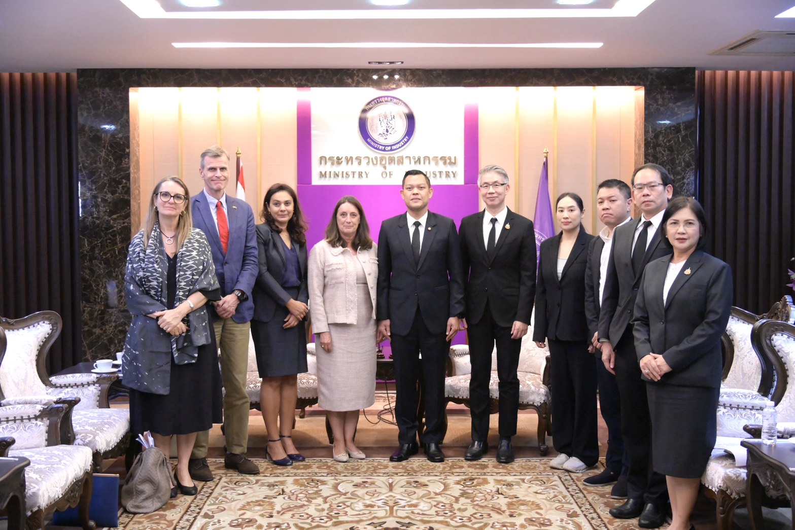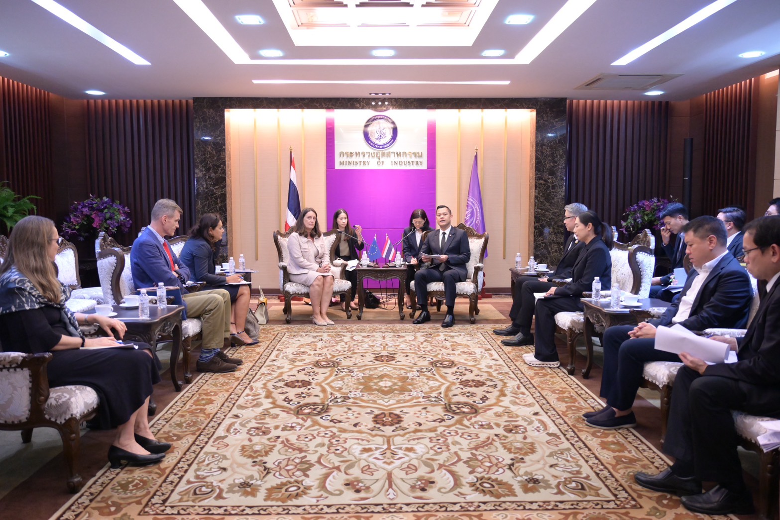 กรุงเทพฯ - 16 กุมภาพันธ์ 2569 นายธนกร วังบุญคงชนะ รัฐมนตรีว่าการกระทรวงอุตสาหกรรม ให้การต้อนรับ นางลุยซา ราแกร์ (Luisa Ragher) เอกอัครราชทูตวิสามัญผู้มีอำนาจเต็มแห่งสหภาพยุโรปประจำประเทศไทยและคณะ ในโอกาสเข้าพบและหารือแนวทางความร่วมมือการขับเคลื่อนด้านอุตสาหกรรมระหว่างประเทศไทยและสหภาพยุโรป โดยมี นายณัฐพล รังสิตพล ปลัดกระทรวงอุตสาหกรรม นางสาวพลอยลภัสร์ สิงห์โตทอง ที่ปรึกษารัฐมนตรีว่าการกระทรวงอุตสาหกรรม นายพลวศุตม์ มหาเอี่ยมศิริ ประธานคณะที่ปรึกษาของรัฐมนตรีว่าการกระทรวงอุตสาหกรรม นายนรุณ สุขสมาน รองผู้อำนวยการสำนักงานเศรษฐกิจอุตสาหกรรม นางสาวอารยา ไสลเพชร รองอธิบดีกรมโรงงานอุตสาหกรรม และเจ้าหน้าที่จากหน่วยงานที่เกี่ยวข้องเข้าร่วมด้วย ณ ห้องรับรอง 1 ชั้น 2 อาคารสำนักงานปลัดกระทรวงอุตสาหกรรม