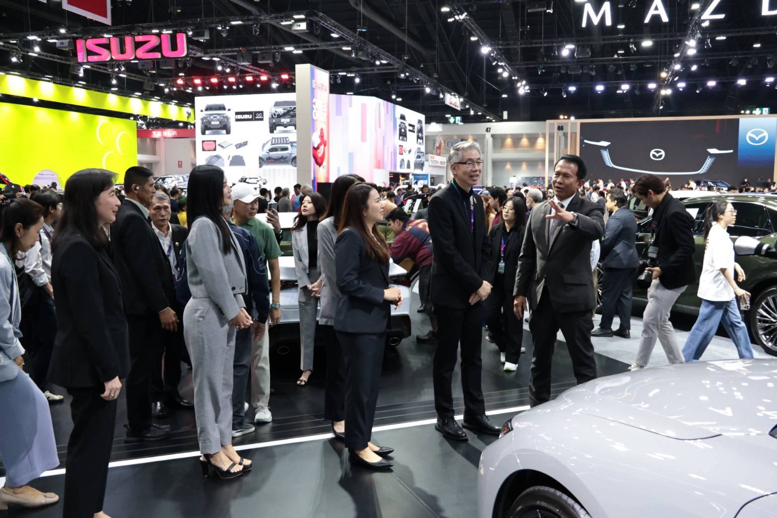 ในการนี้ ปลัดกระทรวงอุตสาหกรรมและคณะได้เยี่ยมชมบูธจัดแสดงยานยนต์ พร้อมให้กำลังใจผู้ประกอบการทั้งไทยและต่างประเทศที่นำเทคโนโลยีและนวัตกรรมยานยนต์สมัยใหม่มาจัดแสดง ซึ่งถือเป็นกลไกสำคัญในการขับเคลื่อนอุตสาหกรรมยานยนต์ของประเทศ ช่วยกระตุ้นเศรษฐกิจและสร้างโอกาสการลงทุนในภาคอุตสาหกรรม โดยในปีนี้มีผู้ประกอบการตอบรับเข้าร่วมออกบูธรวม 45 บริษัท แบ่งเป็นบริษัทรถยนต์ 37 บริษัท และรถจักรยานยนต์ 8 บริษัท พร้อมการเปิดตัวรถรุ่นใหม่ไม่น้อยกว่า 10 รุ่น ครอบคลุมทั้งยานยนต์ไฟฟ้าและพลังงานทางเลือก เพื่อตอบสนองความต้องการของผู้บริโภคยุคใหม่ นอกจากนี้ ผู้ประกอบการยังได้ปรับกลยุทธ์ด้านราคาและนำเสนอเงื่อนไขทางการเงินที่เอื้อต่อการตัดสินใจซื้อของผู้บริโภค อาทิ การตั้งราคาที่เข้าถึงได้ง่ายขึ้น แคมเปญส่งเสริมการขาย และโปรแกรมผ่อนชำระที่มีความยืดหยุ่น ส่งผลให้ประชาชนสามารถเข้าถึงยานยนต์ได้สะดวกยิ่งขึ้น และช่วยกระตุ้นการหมุนเวียนทางเศรษฐกิจในภาพรวม