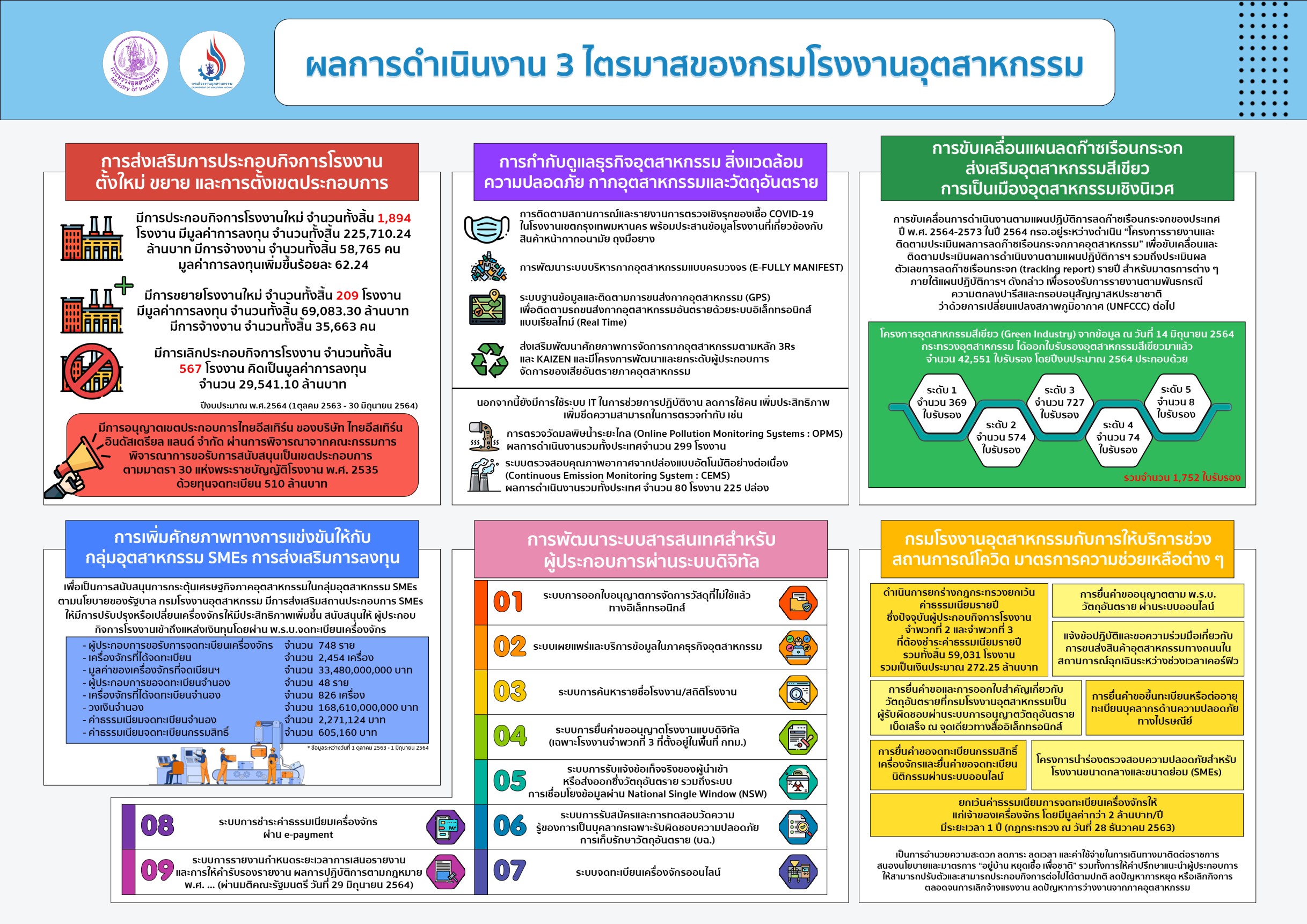 ด้านนายประกอบ วิวิธจินดา อธิบดีกรมโรงงานอุตสาหกรรม กล่าวเสริมว่า กรอ. ได้ดำเนินการตรวจสอบและกำกับดูแลการประกอบกิจการโรงงานในเขตกรุงเทพมหานคร โดยสามารถตรวจติดตามและกำกับดูแลการประกอบกิจการโรงงานในพื้นที่กรุงเทพฯ ได้ครบ 100% ซึ่งเป็นไปตามแผนที่กำหนดไว้ ขณะเดียวกันมีการติดตามสถานการณ์และรายงานการตรวจเชิงรุกของเชื้อโควิด-19 ในโรงงานเขตกรุงเทพมหานคร พร้อมประสานข้อมูลโรงงานที่เกี่ยวข้องกับสินค้า หน้ากากอนามัย ถุงมือยาง มีการพัฒนาระบบบริหารกากอุตสาหกรรมแบบครบวงจร (E-FULLY MANIFEST) มีระบบฐานข้อมูลและติดตามการขนส่งกากอุตสาหกรรม (GPS) เพื่อติดตามรถขนส่งกากอุตสาหกรรมอันตรายด้วยระบบอิเล็กทรอนิกส์แบบเรียลไทม์ (Real Time) และส่งเสริมพัฒนาศักยภาพการจัดการกากอุตสาหกรรมตามหลัก 3Rs และ KAIZEN และมีโครงการพัฒนาและยกระดับผู้ประกอบการจัดการของเสียอันตรายภาคอุตสาหกรรม