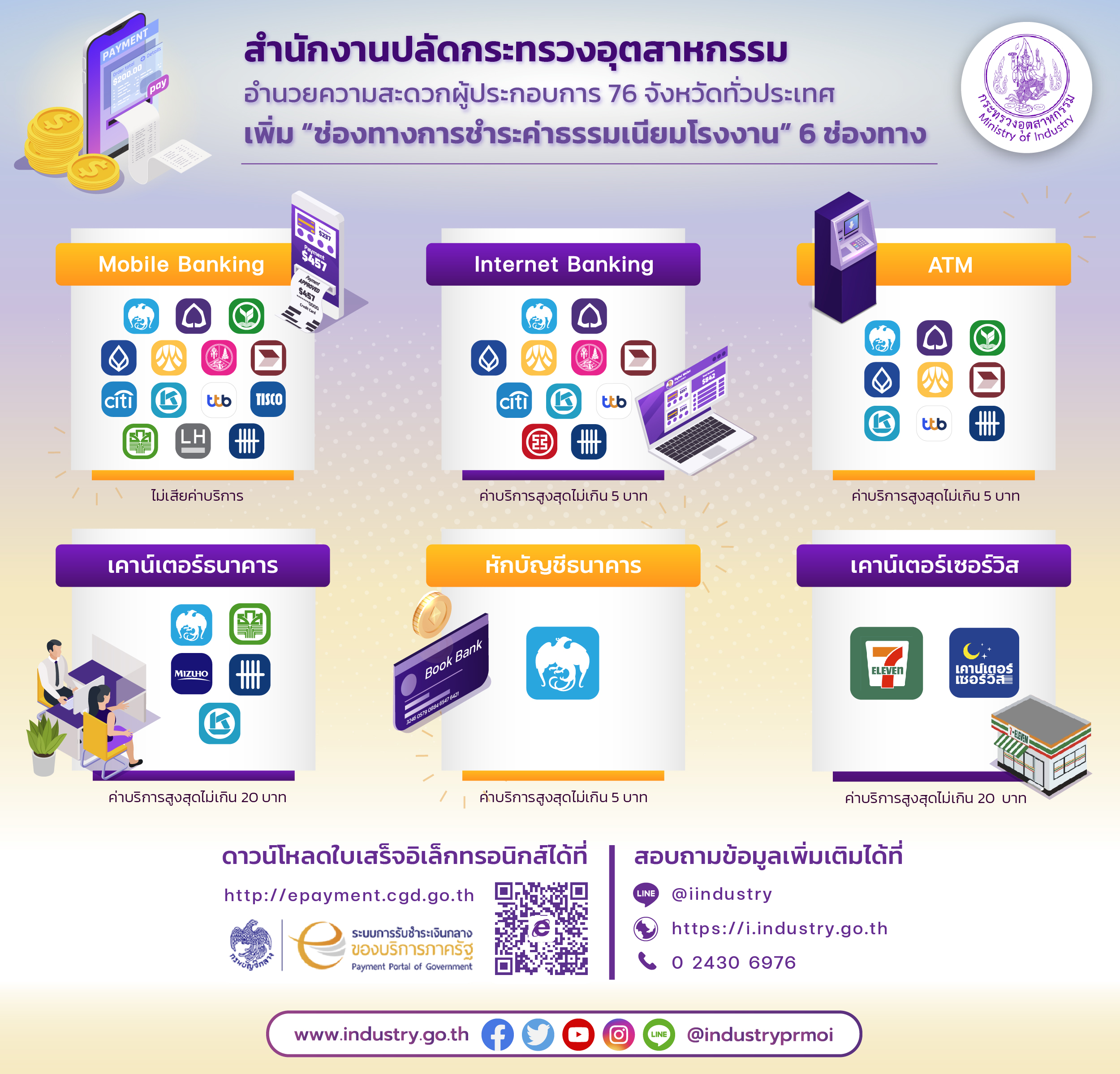 ”สำนักงานปลัดกระทรวงอุตสาหกรรม” อำนวยความสะดวกผู้ประกอบการ 76 จังหวัดทั่วประเทศ เพิ่มช่องทางการชำระค่าธรรมเนียมโรงงาน 6 ช่องทาง ดังนี้